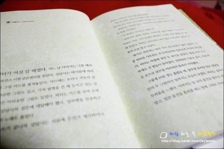 프롤로그 부분은 옅은 연두빛 칼라 그림 위에 글자들이 인쇄되어 있답니다.