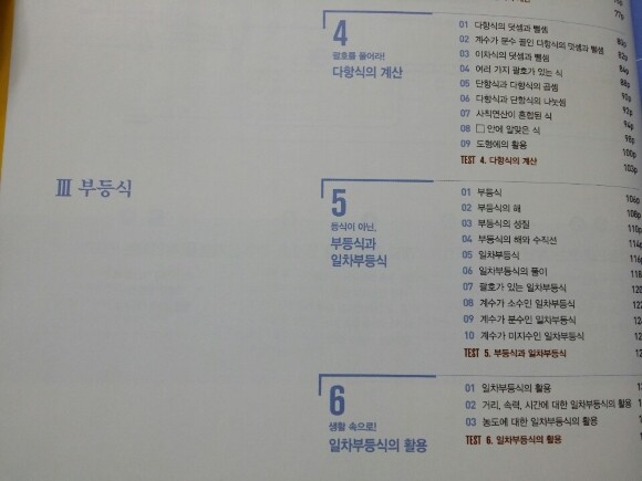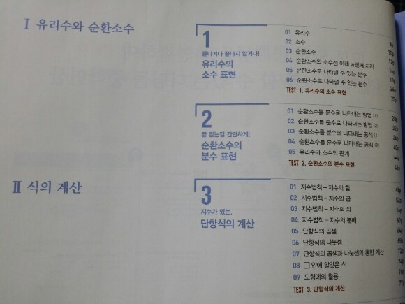 유리수와 순환소수, 식의 계산, 부등식을 집중적으로 다뤄주고 있어요.