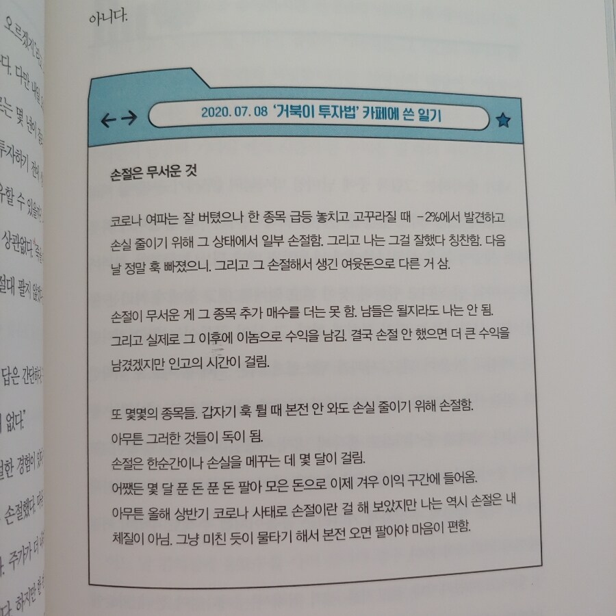 분활매수, 존버, 분활 매도, 적자 종목에는 투자하지 않고, 유보율이 1,000%이상인 종목을 골라 투자하며, 수익을 만들어가는 저자의 주식 투자 이야기는 무척이나 흥미진진했다. 서울대를 간 의지만큼이나 절대 손절하지 않겠다는 의지가 강하게 느껴지기도 했다.