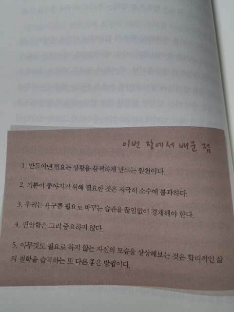 7장 ‘만들어 낸 필요가 우리를 불행하게 한다’ 라는 이 부분이 나는 가장 기억에 오래 남을 것 같다.