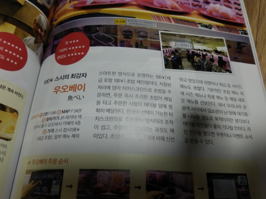 스시의 최강자. 우오베이. 너무나도 공감하는 말이다. 내 여행 블로그 후쿠오카 편을 보면 우오베이에 몇 번을 들렸는지 알 수 있다. 후쿠오카에 가면 반드시 2번 이상 들리는 곳이다. 맛도 맛이지만 가격은 더욱 놀랍다. 접시 당 100엔. PC방 같은 분위기 속에서 레일 위로 오는 초밥을 맛 볼 수 있다. 이 책 P.167에 자세히 소개되어 있다. 일본의 가게나 식당을 들리면 우리나라의 미친 물가에 다시 놀라게 된다.