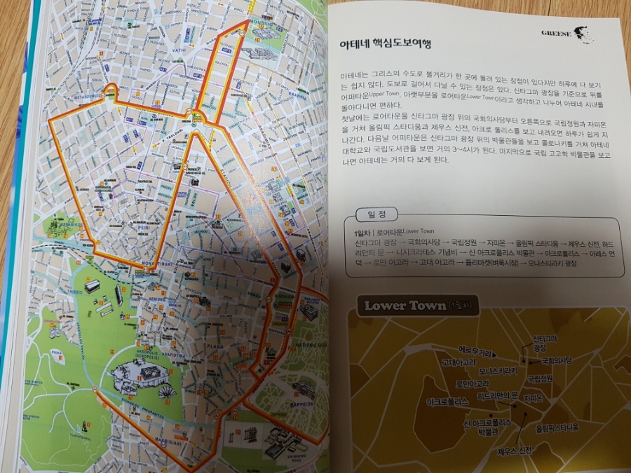 트래블로그 그리스 편의 출발지는 아테네이다. 아테네 한 곳만으로도 볼거리가 넘쳐난다. 택시는 바가지로 유명하기 때문에 책에서는 권하지 않고 있다. 버스, 지하철, 시티투어, 트램 등 다양한 교통수단이 잘 설명되어 있으니 운전에 자신이 없다면 아테네 외곽에 차를 세우고 다른 교통편을 이용하도록 하자. 걷기를 좋아하는 여행자라면 핵심도보 여행도 잘 설명되어 있다. 참고로 나도 도보여행을 매우 좋아한다. 다른 곳들과 달리 아테네는 도보 여행이 2일 코스로 소개되어 있다. 그만큼 볼거리가 많다. 박물관과 각종 신전, 아크로폴리스, 각종 문, 기념비와 전망대, 고대 극장과 스토아, 아고라 등 사진으로만 봐도 눈이 즐겁다. 아고라와 스토아 등 그리스 유적의 명칭은 지금도 여러 곳에서 사용되고 있으니 미리 알고 가면 여행에 많은 도움이 될 듯하다. 아테네에는 문화유적 외에도 여러 시장과 마트 등도 잘 갖추어져 있다.
