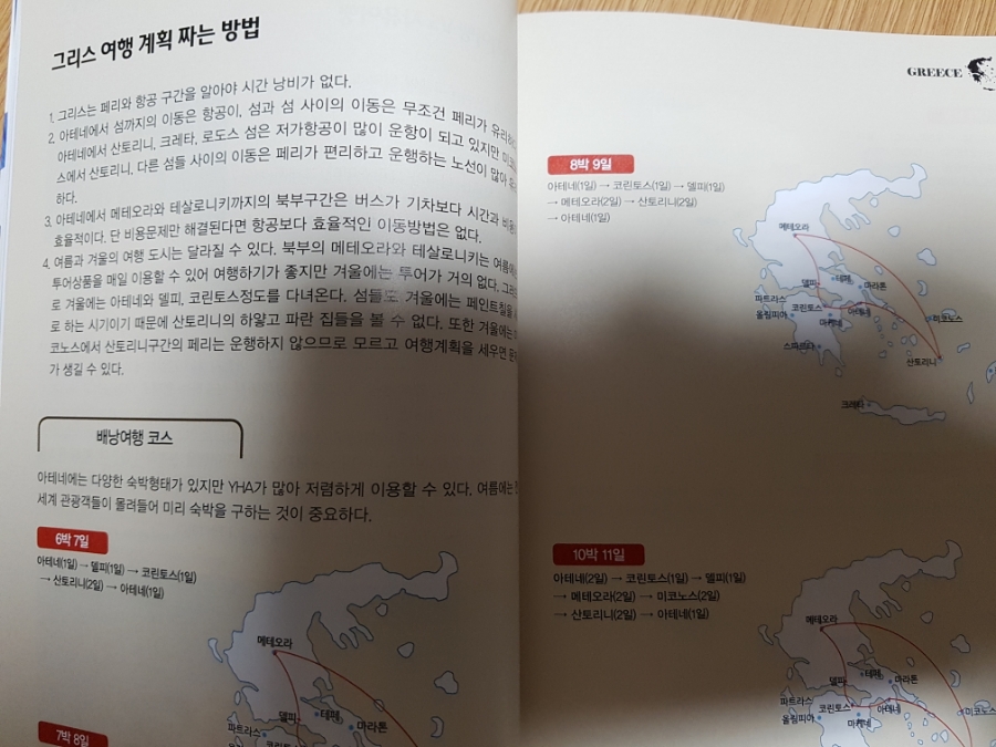 여행 추천일정은 다른 나라에 비해서는 긴 편이다. 최소 6박 7일의 일정부터 시작한다. 그만큼 그리스는 볼 것이 많은 여행지이다. 패키지가 아니라면 렌트를 할 가능성이 높은데 교통편에 대해서도 자세히 나와 있으니 걱정하지 말자. 이 외에도 성지순례코스, 신혼여행코스, 와인투어 코스 등 여행자의 테마에 맞게 일정을 소개해주고 있다. 트래블로그의 최대 장점은 바로 이런 일정 제공이 아닐까? 아테네를 벗어나면 한적하기 때문에 운전을 하는데는 큰 무리가 없다고 한다. 나도 이번 겨울 유럽을 한 달에 걸쳐서 다녀왔는데 도심지를 제외하고는 운전에 문제가 없었다. 그리스는 외곽은 프랑스, 독일 같은 나라들보다 더 한적하다니 안심이 된다. 이 외에도 각종 교통수칙과 운전 수칙에 대해서 잘 나와 있으니 미리 숙지하자. 주유소는 거의 다 셀프 주유소이며, 기름값은 우리나라와 비슷하다고 한다.