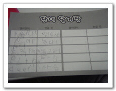 영어단어판에는 울 아들이 외우지 못한 다섯개의 영어단어와 뜻을 썼습니다