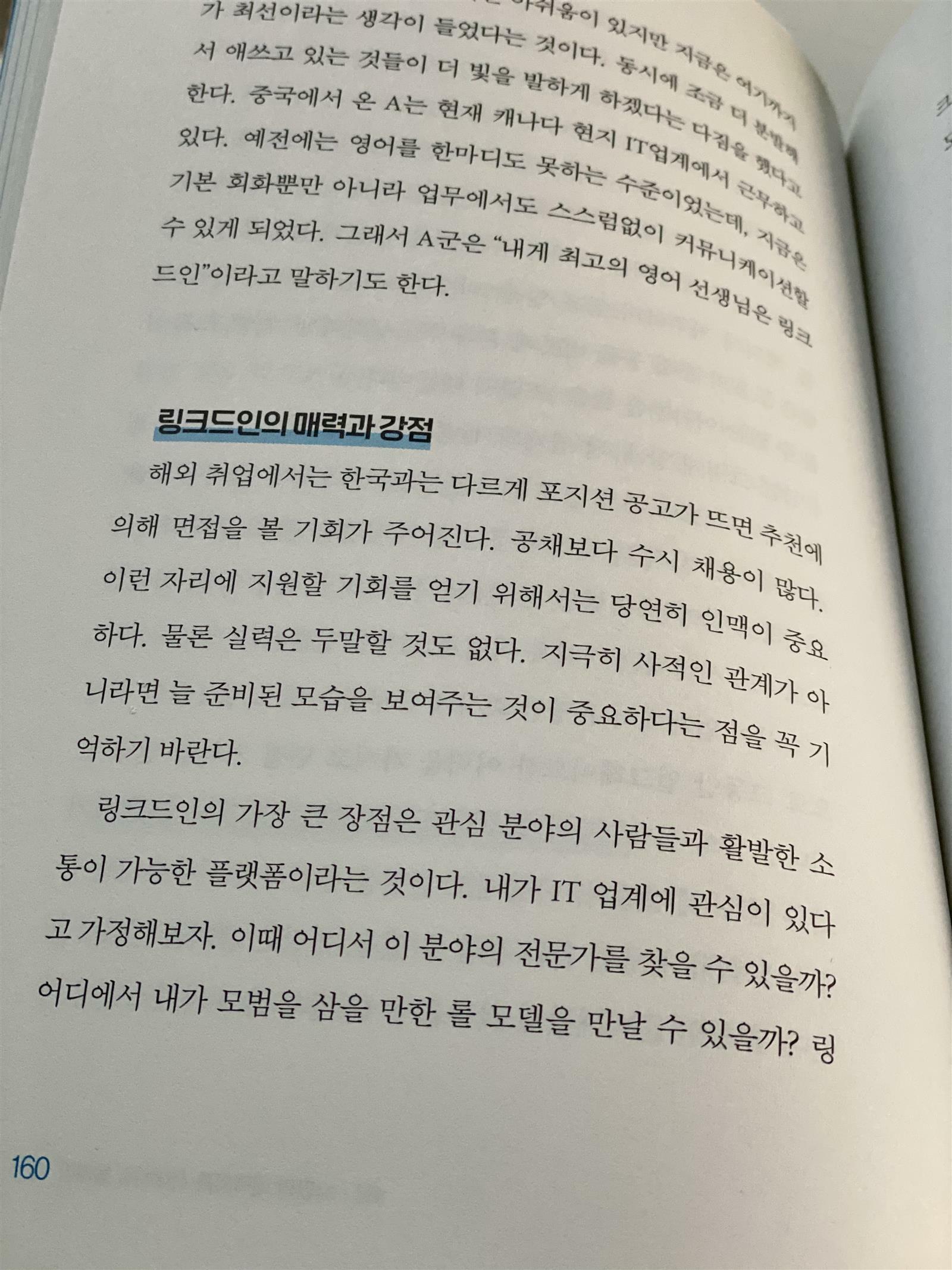 이러한 저자의 능력은 어떻게 이루어진 것일까. 물론 저자의 외향적, 사람들과의 친밀함, 커뮤니케이션능력, 도전정신, 행동력 때문일 수도 있다. 여기에 ‘링크드인’ 이라는 강력한 네트워크로 인해 자신의 ‘퍼스널브랜드’ 구축에 성공했고 원하는 마케팅관련 해외취업도 성공했다. 그리고 부수적으로 영어커뮤니케이션능력도 향상되었다.