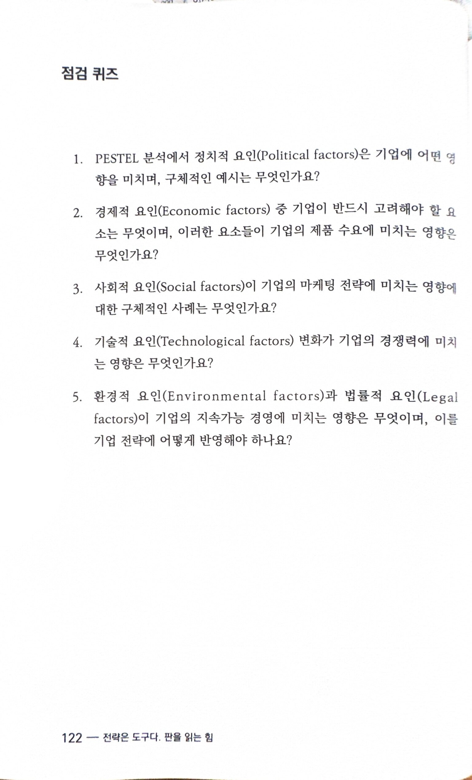 특히 인상 깊었던 건, 세상을 다각도로 분석하는 PESTEL 전략—정치, 경제, 사회, 기술, 환경, 법률 등 다양한 관점을 통해 외부 환경을 읽어내는 방법이었다.