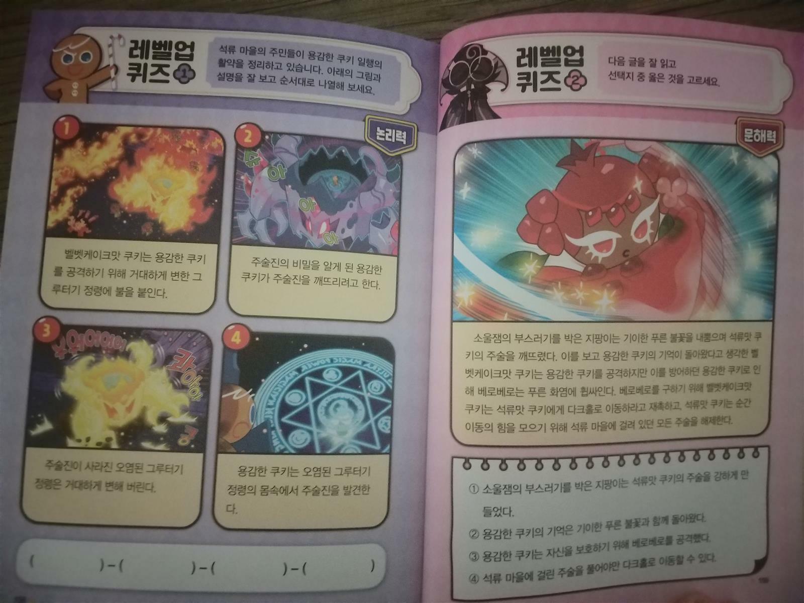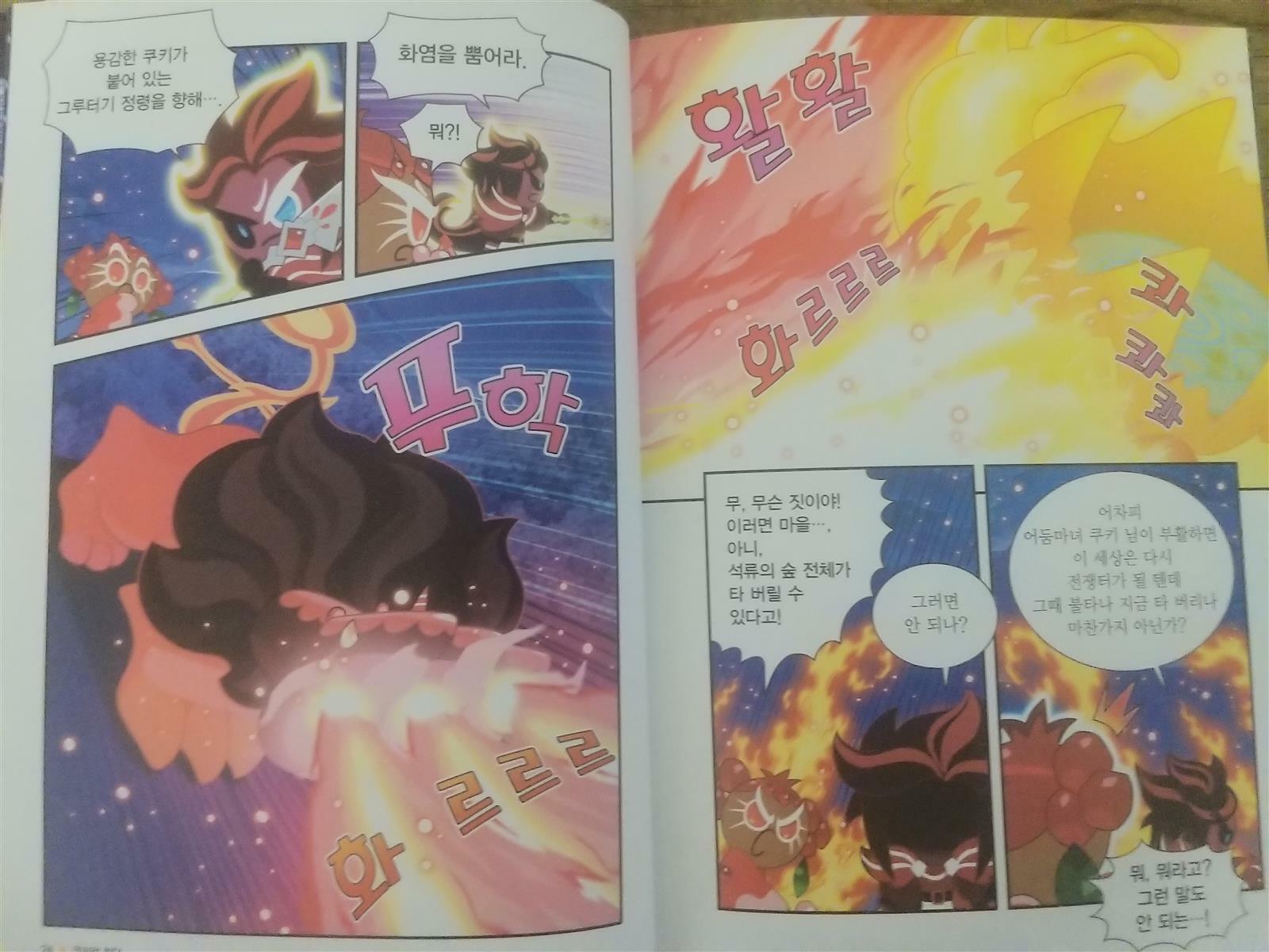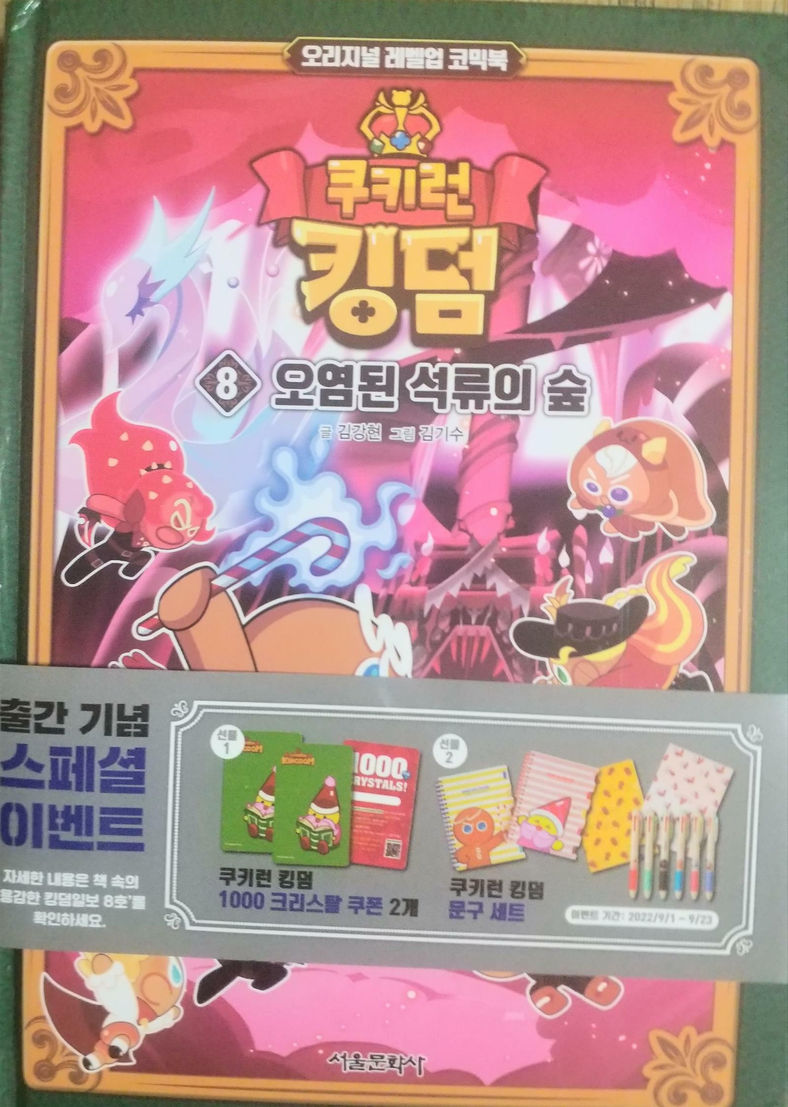 쿠키런 킹덤 게임을 좋아하는 초4아들 쿠키런 책들도 너무나 좋아하는데요~~ 8권은 독버섯 쿠키가 용감한 쿠키에게 지팡이를 떨어뜨리고 나무정령과 싸우는 장면부터 나오네요.. 그루터기 정령의 정신을 가둬놓은 주술진을 용감한 쿠키는 마법지팡이로 깨뜨리려하고 벨벳 케이크맛 쿠키는 베로베로에게 시켜 그루터기정령에게 불을 붙여 거대하게 만들어 버리지요.. 베로베로를 불태우는 푸른 불꽃을 없애기위해 어둠마녀 쿠키의 힘이 필요한 감초맛 쿠키일행은 석류마을의 주술을 풀어 그힘으로 대륙끝으로 이동하게 되고 어둠 마녀의 쿠키의 부활을 막기위해 신수인 설탕백조를 찾아가려는 용감한쿠키일행들 나뭇가지틈 호수에 사는 설탕백조를 과연 찾을수 있을지 너무나 흥미진지한 쿠키런 킹덤 8권 오염된 석류의 숲이었답니다~~ 책뒤에 있는 레벨업 퀴즈로 용감한 쿠키일행의 활약을 순서대로 아들과 이야기해보는 시간도 가질수있어 좋았답니다.. 벌써부터 쿠키런 킹덤 9권 언제 나오냐고 물어보네요~~ 출판사로부터 도서협찬을 받았고 본인의 주관적인견해에 의하여 작성함 #쿠키런킹덤8 #오염된석류의숲 #서울문화사 #용감한쿠키 #모험이야기