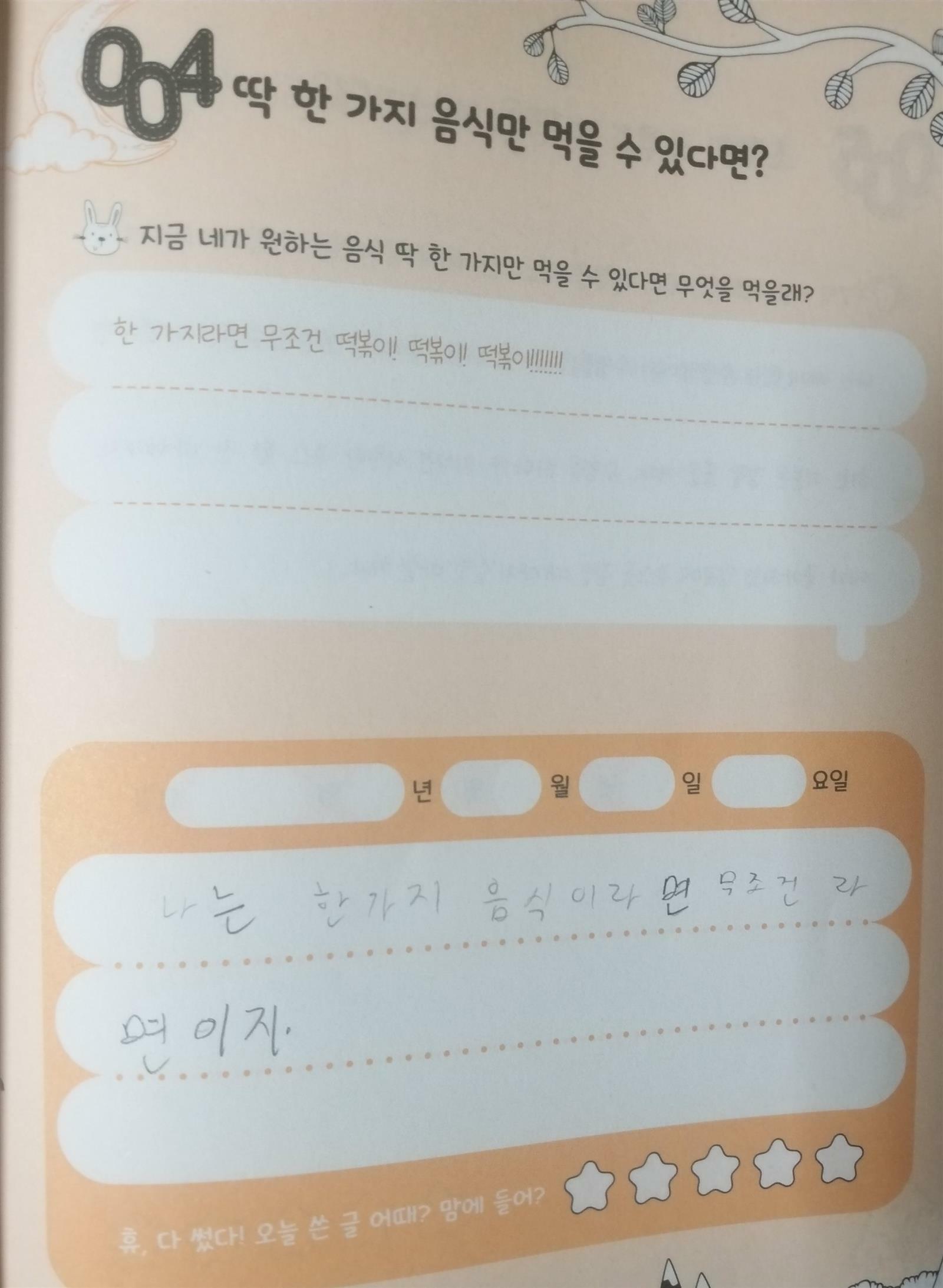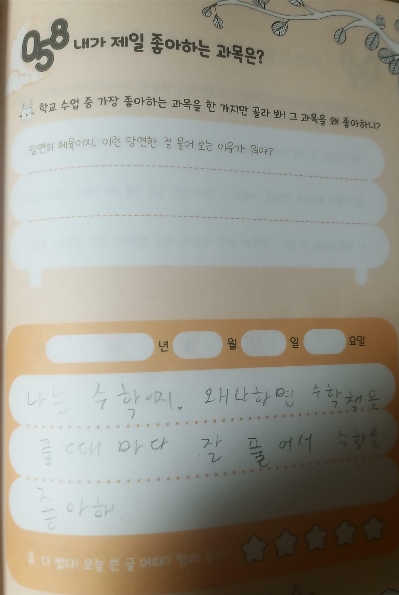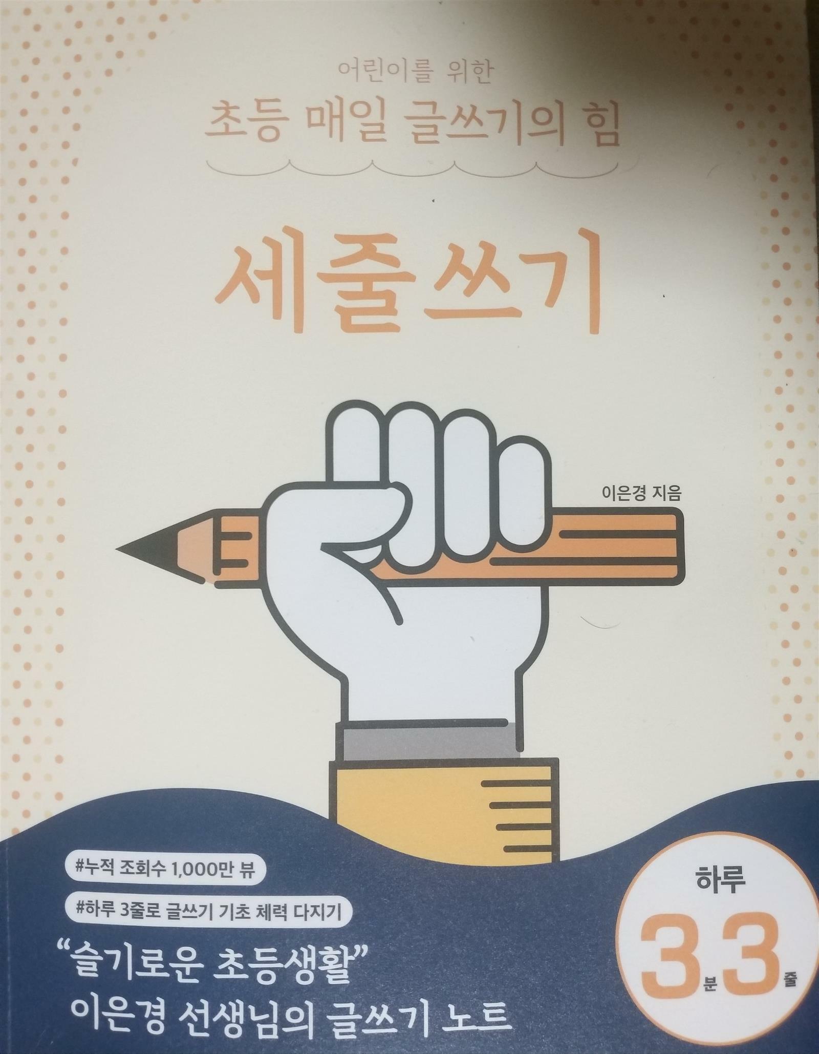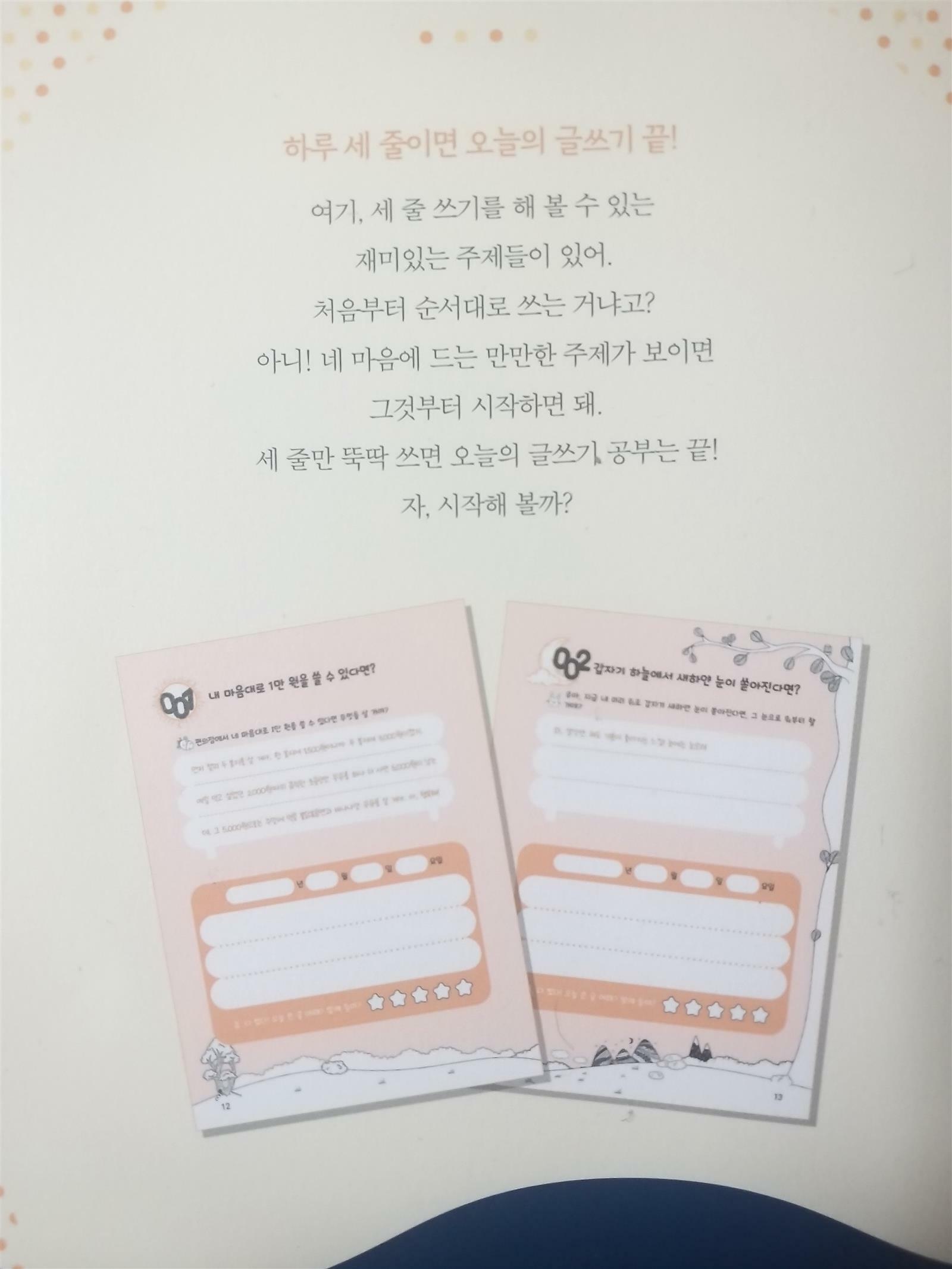 이은경선생님께서 만드신 초등 매일 글쓰기의 힘 세줄쓰기를 글쓰기를 좋은기회에 만나 보았습니다~ 120개의 재미있는 주제들중 마음에 드는 주제를 선택해서 하루 1개씩 도전해보는거래요^^ 글쓰기를 어려워하고 힘들어하는 초등4학년 아들이라 좀 걱정이 되었는데 120개 주제로 구성된 세줄쓰기라 걱정은 한시름 놓을수 있을꺼같아요~~ 책장을 펼치다 맘에 가는 주제선택이라니 너무 획기적인 방법 인거 같은^^ 내가 가장 즐겨보는 유튜브채널은? 내가 제일 좋아하는과목은? 가장 재미있는 게임을 뽑는다면? 다양한 주제와 예시까지 되어 있어 아들과 세줄쓰기 도전은 재미있게 해볼수 있지 싶어요~ 출판사로부터 도서협찬을 받았고 본인의 주관적인견해에 의하여 작성함 #초등매일글쓰기의힘 #세줄쓰기 #이은경선생님 #120개주제 #세줄쓰기비법