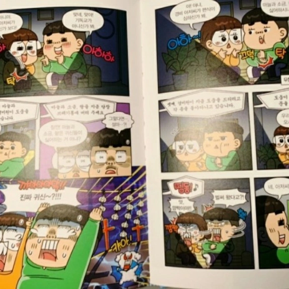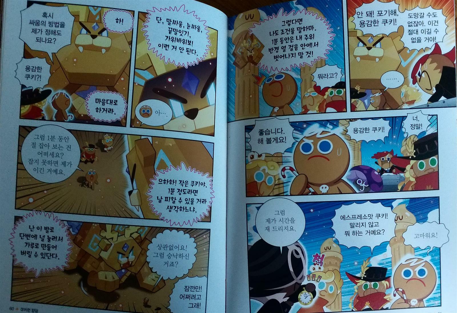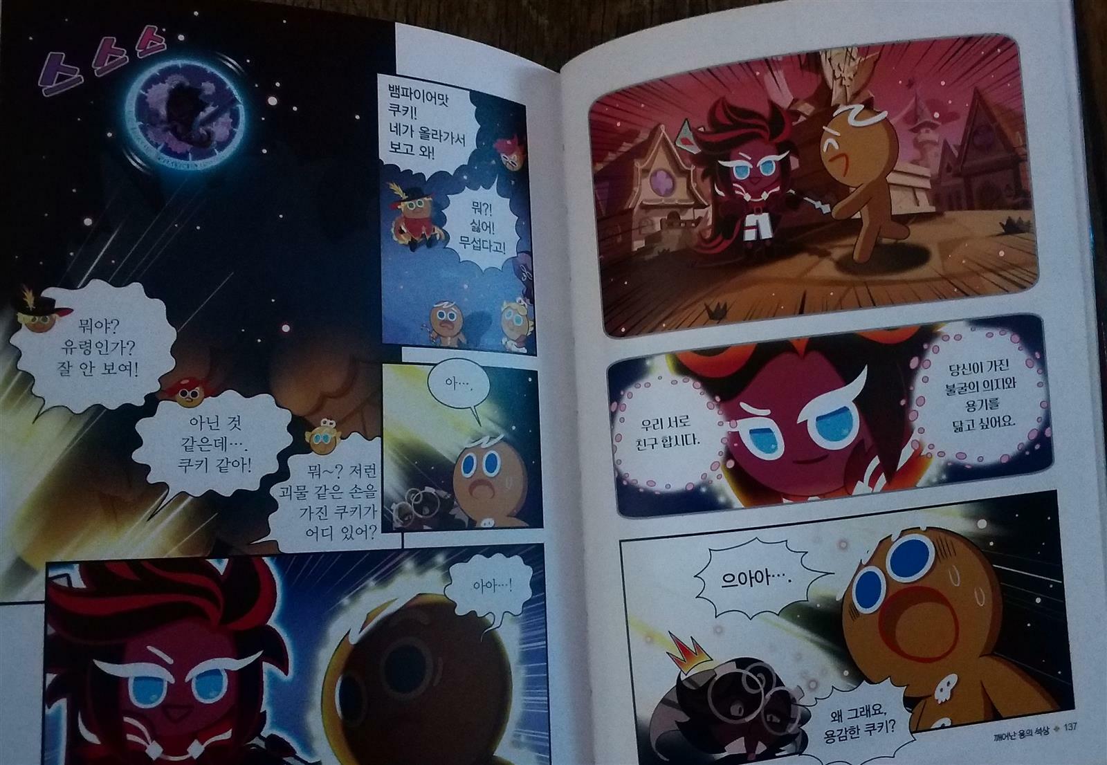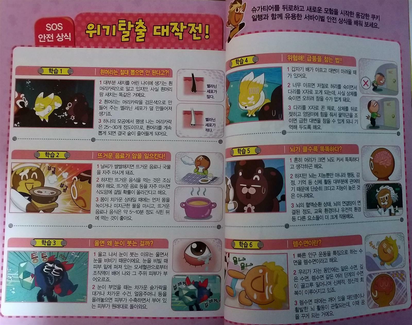 샤벳상어맛 쿠키에게 신의 눈물을 빼앗긴 블랙커스는 폭주하기 시작하고 간신히 도망치는 샤벳 상어맛 쿠키는 초대왕 쿠키의 관을 발견하게 되지요.. 신의 눈물을 관속에 보관하려고 열어보는데 거기에는 초대왕의 전설의 무기가 .. 초대왕은 미래 슈가티어의 위기를 예언하고 관속에 전설의 무기를 함께 보관하게 했었나 봐요.. 샤벳상어맛쿠키는 초대왕의 전설의 무기로 블랙서커를 없애고 맙니다!! 드디어 슈가티어는 다시 아름다운 도시로 변하게 된답니다.. 랍스터맛 쿠키는 자기잘못을 용서해달라고 샤벳상어맛 쿠키에게 얘기하는데 샤벳상어맛쿠키는 랍스터맛쿠키또한 슈가티어를 사랑해서 한일이라는걸 알고 있다고 바로 포용하지요.. 랍스터맛쿠키처럼 잘못한 일이 있다면 사과도 하고 샤벳상어맛쿠키처럼 잘못한 이도 포용할수있는 마음을 키워나가야겠다 생각이 들었어요.. 소다맛섬쿠키의 섬으로 박하수염 고래등을 타고 떠나는 쿠키친구들 소다맛 쿠키집이 부서져있는데 부서진 가구밑에 쪽지가.. " 살려줘~~ 악몽의 서커스 시나몬맛 " 시나몬맛 쿠키와 소다맛 쿠키는 도시로 가서 마술쇼를 한다고 했는데 .. 왜 이런 쪽지를.. 용감한 쿠키와 쿠키친구들은 사라진 시나몬맛 쿠키와 소다맛쿠키를 찾기위해 페퍼타운도시로 다시 떠납니다~ 페퍼타운 도시에 도착한 쿠키친구들.. 마을사람들에게 마술쇼를 시나몬맛쿠키와 소다맛쿠키를 물어봐요~ 그분으로 부터 페퍼타운 도시에 떠돌이 서커스단이 들어왔는데 도시에 잠자는 병이 퍼져서 하루종일 잠만자고 아픈곳이 없는데 일어나지 못하고 있다는 얘기도 듣게되지요.. 쿠키멀즈친구들 쓰러진 흉내를 내고.. 피자배달 쿠키는 쿠키멀즈친구들을 해골같이 생긴 건물로 데려가서 쿠키멀즈 친구들을 치료받게 하지요.. 배가 고파서 쓰러진 흉내를 낸 쿠키멀즈들 그곳에서 엄청난 피자들을 다먹어버렸지요~ 아무리 배가 고파도 남의것을 허락도 받지않고 먹는 행동은 하면 안된다고 아이에게 얘기도 해주며 읽었답니다.. 피자주문은 바로 꿈의 서커스단에서한 피자들 피자배달 쿠키와 닥터 뼈다귀와 용감한쿠키친구들은 꿈의 서커스단으로 함께 가게 되지요~ 개비스킷이 꿈의 서커스천막으로 연결이 되어 있는데~~ 과연 쿠키친구들은 사라진 시나몬맛 쿠키와 소다맛 쿠키를 찾을수 있을지 벌써부터 43권 다음 책이 기다려집니다^^ SOS 안전상식 위기탈출대작전 흰머리는 절대로 뽑으면 안된다고, 뜨거운 음료가 암을 일으킨다, 울면 왜 눈이 붓는걸까,위험해 ! 급똥을 참는법, 뇌가 클수록 똑똑하다, 램수면 SOS 안전상식 6가지에 대한 유용한 정보도 알수있어 좋았어요^^ 출판사로부터 도서협찬을 받았고 본인의 주관적인견해에 의하여 작성함 #쿠키런서바이벌대작전 #쿠키런킹덤 #쿠키들의흔적편 #안전상식학습만화 #서울문화사