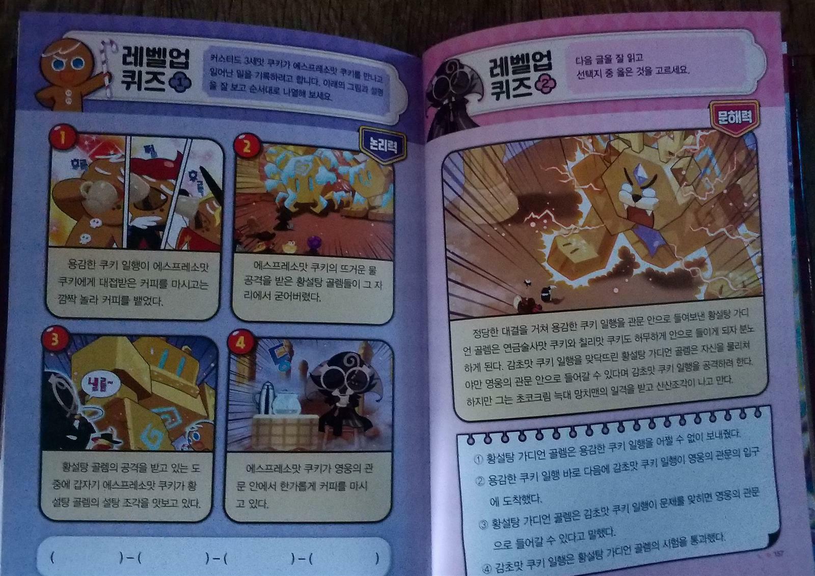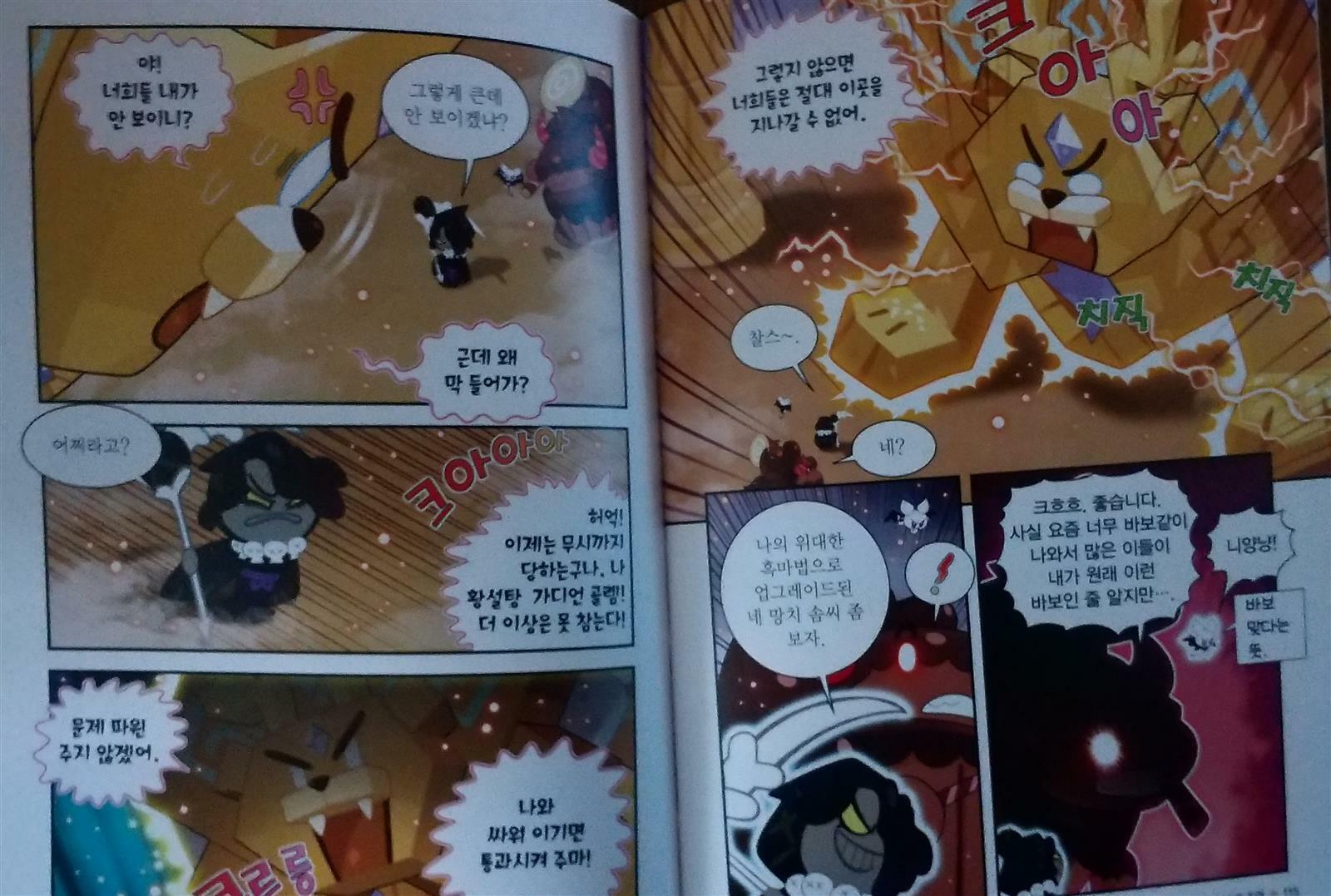 우리아이가 넘 좋아하는 쿠키런 킹덤 게임도 좋아하지만 책도 넘 좋아하지요~~ 기다리던 쿠키런 킹덤6권 영웅의 관문 상편 오자마자 읽고또 읽고 했답니다~~ 영웅의 관문으로 가기 위한 여정을 계속 하는 용감한 쿠키 친구들~~ 드디어 영웅 관문에 도착하지만.. 황설탕 가디언 골렘이 지키고 있는데 영웅의 자격을 얻어야 들어갈수 있다고;; 용감한 쿠키일행들 가디언 골렘이 낸 문제를 듣고는 기겁 하지요.. 용감한 쿠키는 문제푸는거말고 다른 방법은 없냐고 물어보는데.. 가디언 골렘과 싸워서 이기면 들여보내준다고 하네요~~ 용감한 쿠키는 1분동안 골렘보고 잡아보라고하고 안잡히면 이기는 거라고 하면서 경기를 하게되는데~~ 엄청나게 큰 가디언 골렘과 어떻게 이겨내는지 숨죽이며 읽었답니다~~ 연금술사 쿠키는 그어려운 미적분 문제를 생각조차안하고 답을 말하고~~ 감초맛쿠키와초코크림 늑대망치맨은 가디언 골렘을 망치로쾅쾅!! 부순후 영웅 관문을 통과하지요~~~ 석상위에 뭔가가 있는데... 누구일지~~~하편이 기다려집니다^^ 책뒤쪽 레벨업 퀴즈로 책내용을 잘기억하는지 아이와 함께 문제도 풀어보고 재미있는 쿠키런 킹덤6 영웅의 관문 상편이었습니다~~ 출판사로부터 도서 협찬을 받았고 본인의 주관적인 견해에 의하여 작성함 #쿠키런킹덤6권 #영웅의관문상편 #서울문화사 #쿠키런킹덤신권 #영웅의관문