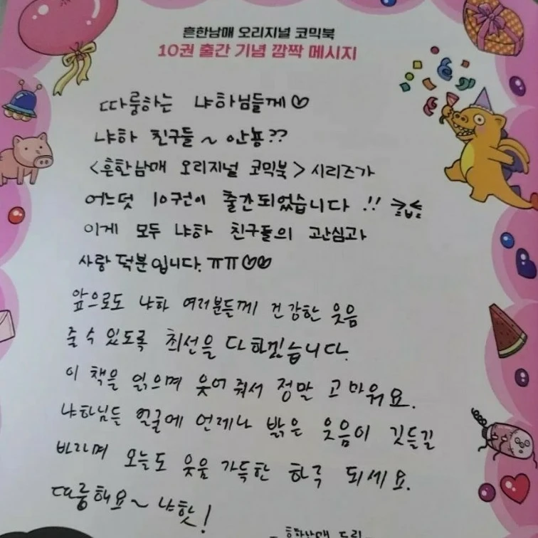 초4 아들램이 열광하는 흔한남매10권이 출간되었어요~~ 티비 방송도 넘 애정하지만 책도 넘 좋아한답니다~^^ 공포의 안내방송,한수앞 내다보기대결~~ 재미난 이야기속으로~~~ 흔한남매 손글씨 편지와 으뜸이의 싸인까지!!! 평생 소장각입니다~~ 흔한남매 포에버 💜 💜