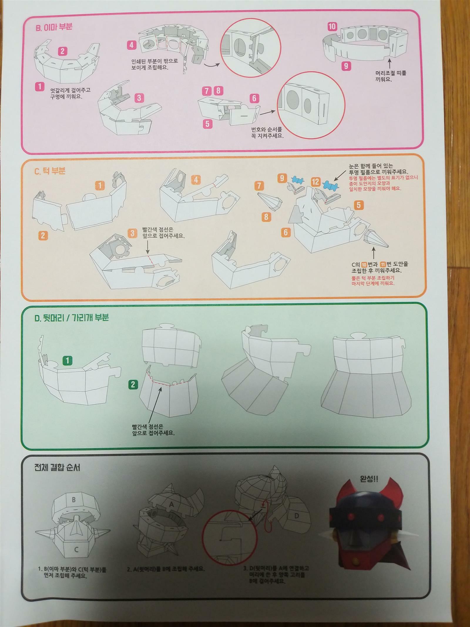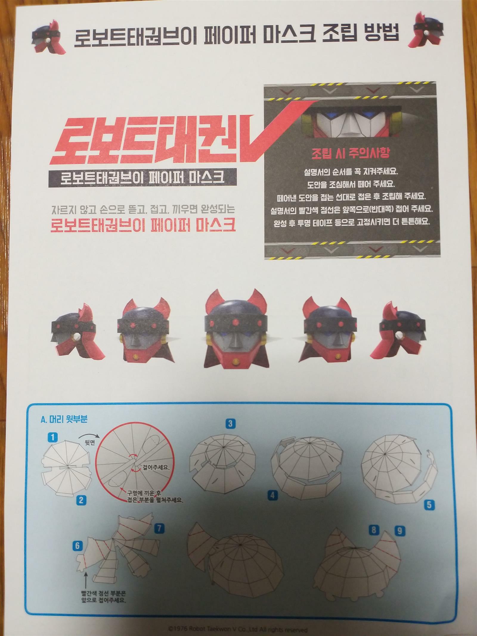 로보트 태권브이 1976년도에 나온 만화이지요 ~ 달려라 달려 로보트야 날아라 날아 태권브이 정의로 뭉친 주먹 로보트 태권 용감하고 씩씩한 우리의 친구 두팔을 곧게 앞으로 뻗어 적진을 향해 하늘을날면 멋지다신난다 태권브이 만만세 무적의 우리친구 태권브이 어릴때 많이 보던 로보트 태권브이인데 페이퍼 마스크가면이라니~~ 아이보다 제가더 흥분했어요^^ 가위로 자르지않고 도안을 조심조심 떼어서 접는 선대로 접은후 조립만 하면 된다니 신기방기 합니다~ A부분은 머리 윗부분 B 부분은 이마부분 C부분은 턱부분 D부분은 뒷머리 가리개부분이랍니다~ 조립시 주의사항으로는 설명서 순서를 잘지켜야한대요~ 순서대로 차근차근하기!! 머리부분부터 조립해보는 초3 아들~~ 끼우는건 하겠는데 끼운게 잘빠진다고 징징징 ㅜㅜ 빠지면 유리테이프로 붙이라고 팁도 알려줬지요~ 설명서가 좀 자세히 되어 있으면 좋겠다고 초3아들램이 건의합니다~~ 설명서봐도 잘모르겠다고ㅜㅜ 초등생이 보아도 쉽게 해주면 더 좋을꺼 같아요^^ 그래도 하나둘씩 열심히 만들었지요~~ 코로나로인해 어디 가기도 힘든 요즘 로보트태권브이 페이퍼마스크로 아이들과 추억여행은 어떠실까요?? 아들과 로보트 태권브이 이야기도 하며 좋은 추억을 만들수도 있어 뜻깊은 시간이었답니다~ 출판사로부터 제품을 제공받아 주관적으로 작성한 후기입니다 #로보트태권브이페이퍼마스크 #두드림엠앤비 #키덜트 #태권브이마스크 #태권브이페이퍼마스크