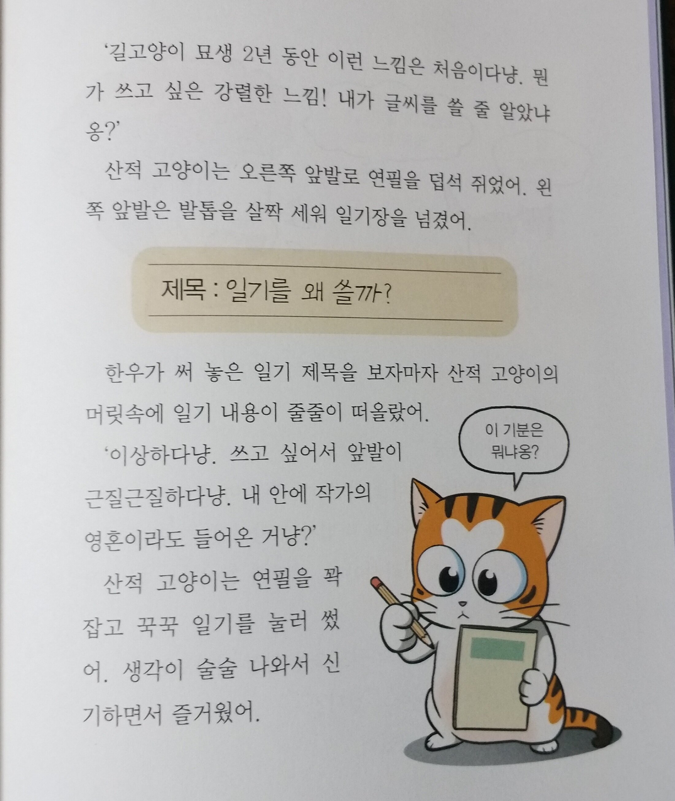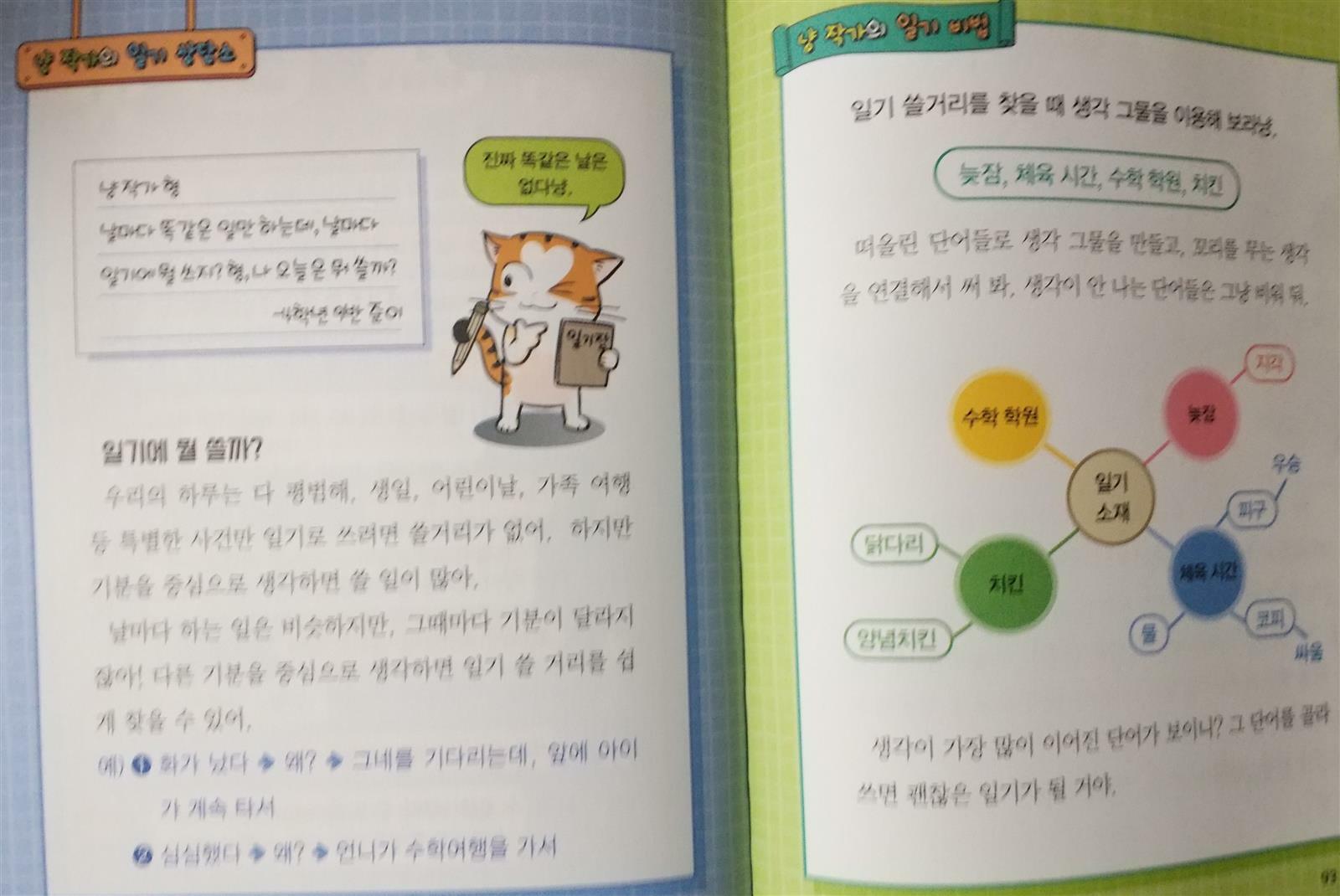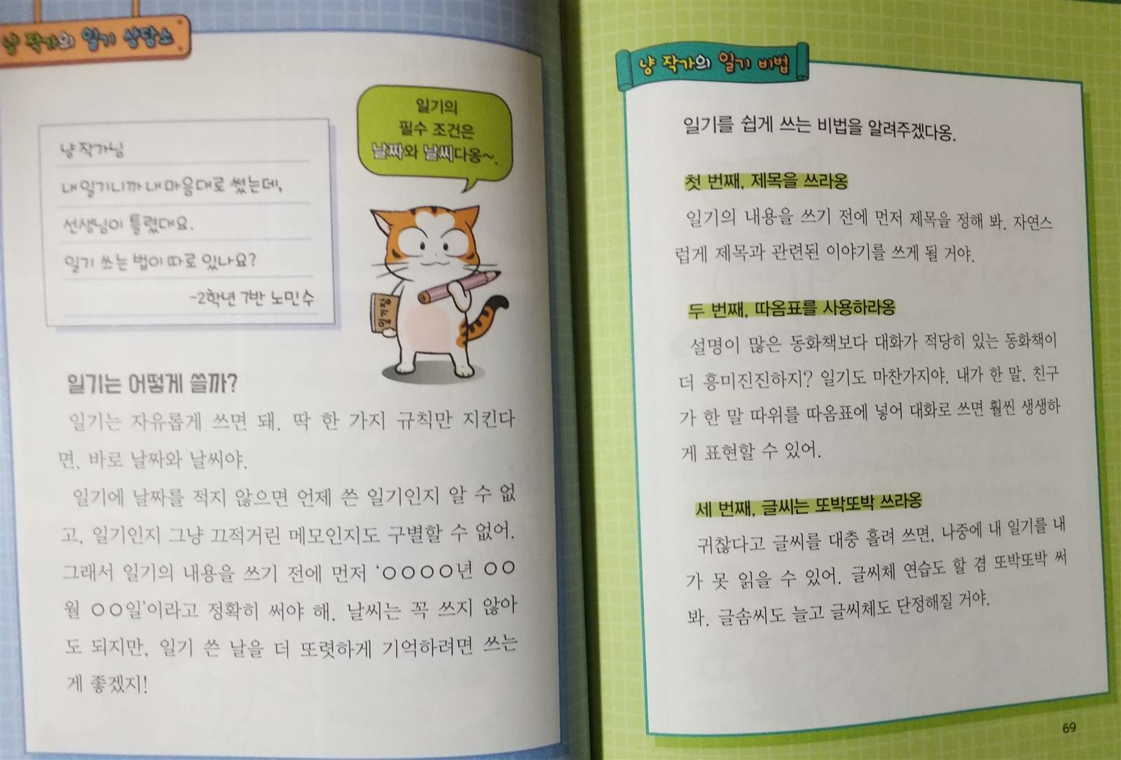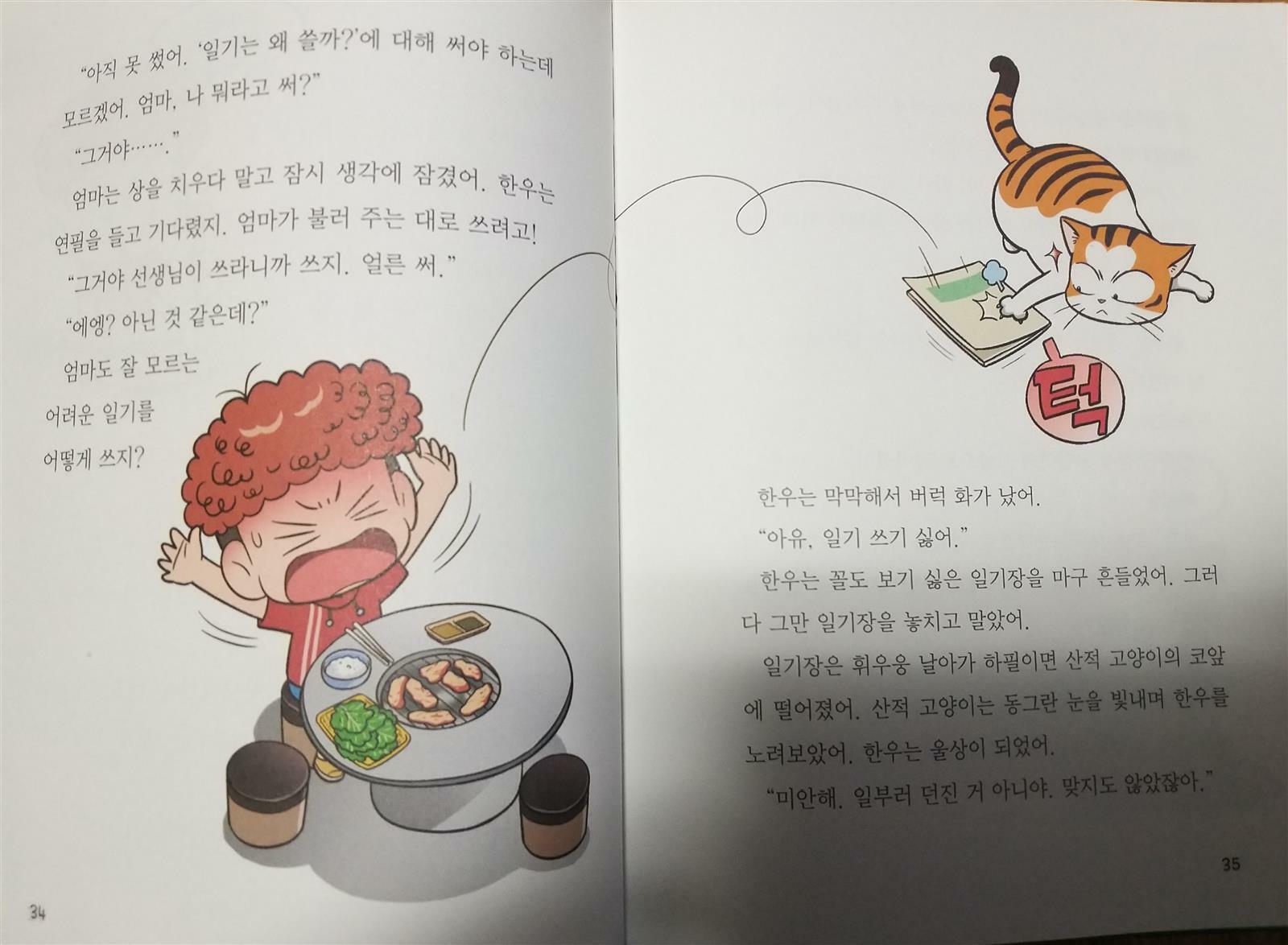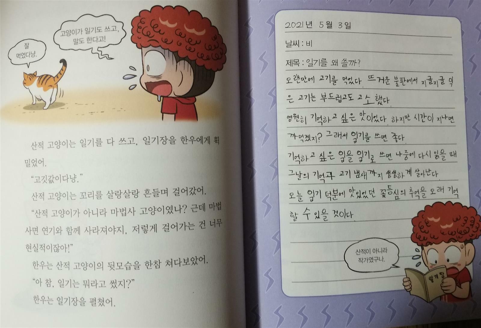 매일 일기쓰기를 하긴 하지만 일기쓰기를 어려워 하는 초3 아들 사실 집에만 있으니 쓸 얘기거리가 없긴 해요~ 겨울방학때 일기쓰기숙제는 꼭 있는데 냥작가님이 일기를 불러 준다니~~ 기대가 넘 큽니다!!~ 화단에 살고 있는 길고양이는 어느날 번개를 맞게 되고 글쓰기능력을 가지게 됩니다~ 배가 고팠던 길고양이는 한우네 고기식당으로 들어와 고기를 얻어 먹으려고 합니다~ 한우는 길고양이를 무서운 나머지 먹던 고기를 던져주며 내쫓으려하지만 길고양이는 고기가 맛나다고 계속 달라고 하지요~ 길고양이가 고기를 넘 맛나게 먹으니 한우또한 처음으로 고기의 맛까지 음미하며 먹어 본답니다~ 엄마의 일기는 다썼니?? 학교숙제인 일기 어려운 일기를 왜써야하는지 궁금하고 화가난 한우는 일기장을 던져버리고 그게 하필이면 길고양이 코앞에 떨어지지요~~ 떨어진 일기장을 연필을 이용해 주우려하지만 연필까지 놓지고 말지요^^ 번개를 맞아 글쓰기 능력을 갖게된 길고양이는 한우의 일기장 제목을 보고 일기를 써내려갔지요^^ 은혜갚은 길고양이인가요~~ 한우의 일기숙제를 해주는~ 길고양이가 일기를 왜쓸까? 질문에 기억하고 싶은일을 일기로 쓰면 나중에 다시 읽을때 기억과 냄새까지 생생하게 생각할수있다고 알려주지요~ 일기숙제를 하기위해 한우는 길고양이를 찾으러 화단으로 찾아가고 길고양이는 한우에게 일기쓰는 비법을 알려줍니다^^ 오늘 날씨와 기분을 생각해 일기를 쓸수있다고 알려주지요~~ "해님이 이글이글" "세상이 하얗게 눈옷을 입은날" 날씨에 생각을 더해서 쓰면 더 좋다고요~ "여우비 반짝 고양이기분도 폴짝" 냥작가의 날씨표현이 기가 막히네요~~ 여우볕이란 용어또한 생각도 못한건데 ~~ 어떻게 이런표현을 하는건지 일기는 날짜와 날씨부터 쓰고 기억에 남는일을 자유롭게 쓰면 된대요~ 또한 일기 쓸거리를 찾을때는 떠올린 단어들로 생각그물을 만들어 꼬리를 무는 생각을 연결하면 일기는 쉽게 쓸수있다고 냥작가님이 일기쓰기 비법을 알려주지요~ 겨울방학 매일같이 일기를 써야하는데 냥작가님이 알려준 일기쓰기비법으로 아들과 일기쓰기 해볼까해요^^ 출판사로부터 도서를 제공받아 주관적으로 작성한후기입니다 #파란정원 #냥작가의 글쓰기상담소 #일기를불러드립니다 #일기쓰기비법 #즐비