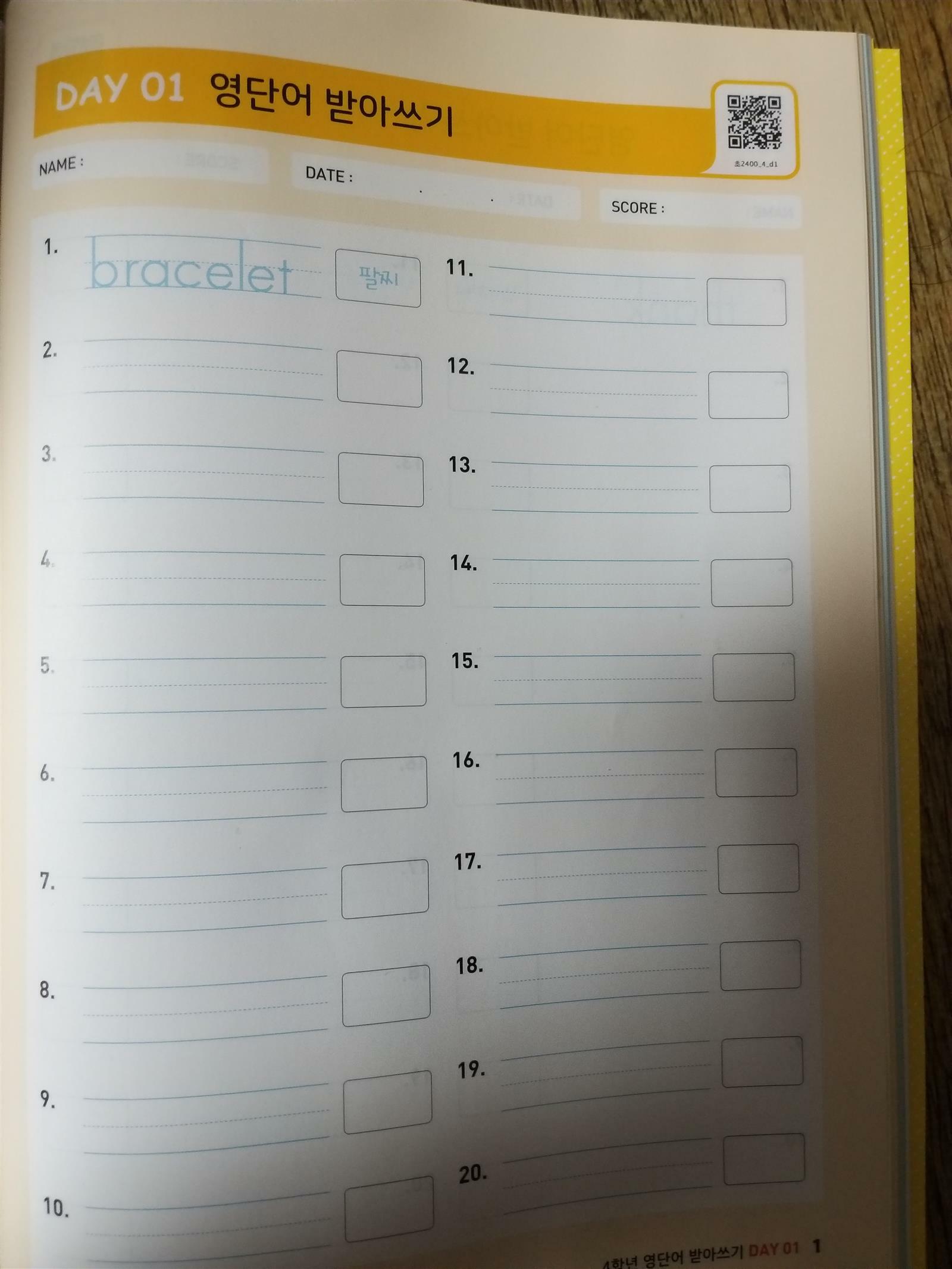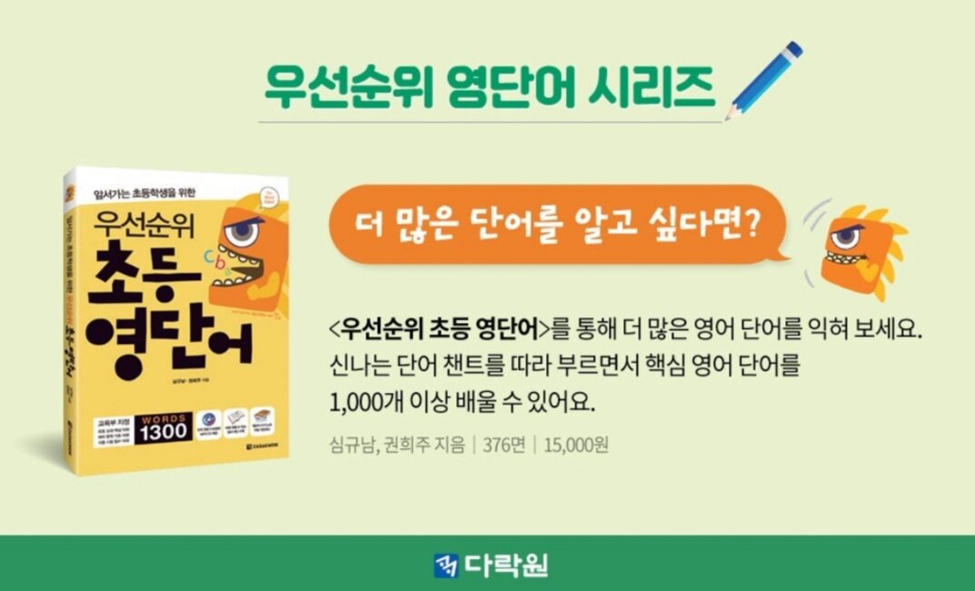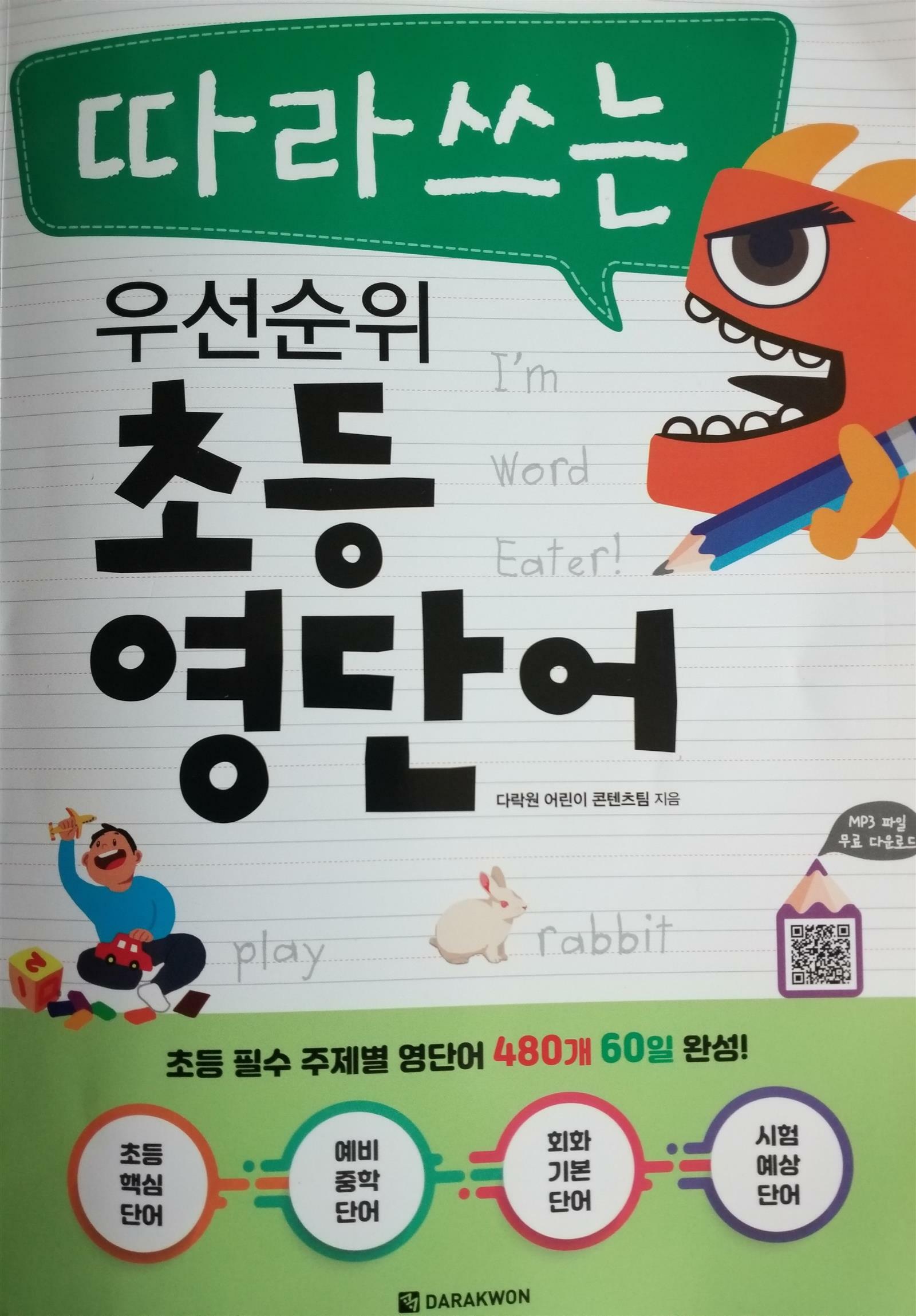 《다락원 따라쓰는 우선순위 초등영단어》 ☆초등핵심 영어단어 480개 60일완성! ☆영단어소리가 한글로 되어있어 쉽게 읽기가능 ☆4줄 따라쓰기로 알파벳쓰는법과 단어의 철자를 정확하게! ☆배운 것은 단어퀴즈로 바로 확인! 영어의 기본은 단어이지요~ 알파벳공부, 파닉스, 사이드워드 공부중인 초3 아이 영어단어쓰기도 해봐야 하는데 고민중일때 눈에 들어온 다락원 따라쓰기 우선 순위초등 영단어 입니다~ 가장 먼저 《알파벳 쓰기 순서》로 알파벳쓰기도 다시 연습해봐요~ ●60개의 주제별 영단어로 하루8개의 단어를 배울수 있어요~ ● 단어체크&소리듣기 배울 영어단어의 철자와 뜻을 먼저 확인하고 단어소리도 한글로 되어 있어 쉽게 읽을수 있답니다~ ■QR 코드 클릭!! 원어민 선생님의 발음을 듣고 익힐수 있어요~ 빨간 동그라미 표시 되어있는 단어는 가장 강하게 들리는곳을 주의해서 들어야 한대요~ ●단어 따라쓰기 4줄에 영어 단어를 따라쓰고알파벳을 쓸때 한글자씩 소리내면서 쓴다음 단어를 통으로 읽으면 단어가 잘 외워진대요~ ●퀴즈풀기 단어를 따라 쓴후 빈칸 채워 단어완성하기, 단어 철자 알맞게 배열하기,그림과 단어 연결하기등 재미있는 퀴즈를 풀며 배운 단어를 아는지 바로 확인해볼수있답니다~ ● REVIEW TEST 10일마다 복습하는 테스트를 할수 있어요~ 그림보고 알맞은 단어고르기, 단어철자 알맞게 배열하기, 알파벳판에서 알맞은 영어 단어 찾기 문제를 풀면서 영어 단어 실력을 확인해 볼 수 있어요~ 공부를 끝낸다음《나의공부진행표》에 공부한날 사과를 칠해서 사과나무를 완성해볼수도 있어요~ 부담없이 다락원 우선순위 초등영단어로 하루 1장씩 8개 단어를 60일동안 열심히 영단어 공부해보겠습니다!! [출판사로부터 도서 협찬을 받았고 본인의 주관적인 견해에 의하여 작성함] #다락원 #따라쓰는우선순위초등영단어 #초등영어 #초등영단어 #60일완성 #초등핵심단어 #예비중학단어 #60일완성 #초등회화기본단어 #시험예상단어