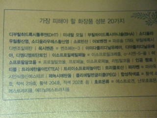 그외에도 많은 성분들의 설명이 있지만 워낙 어렵고 생소해 기억하기가 쉽지 않은데 친절하게도 뒷면에 가장 피해야할 유해성분을