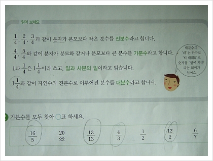 하면서 답을 척척 쓰면서 대분수와 가분수, 진분수가 어떤 건지 이해가 된다고 하더군요.