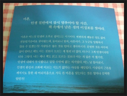 책을 한권씩 읽을때마다 우리는 새로운 사람이 된다고 작가는 말하며 마흔에 잠시 쉬어가며 남은 인생은 책속에서 이정표를 찾으라고 알려준다.