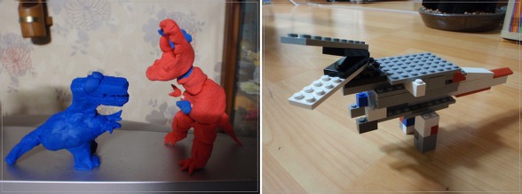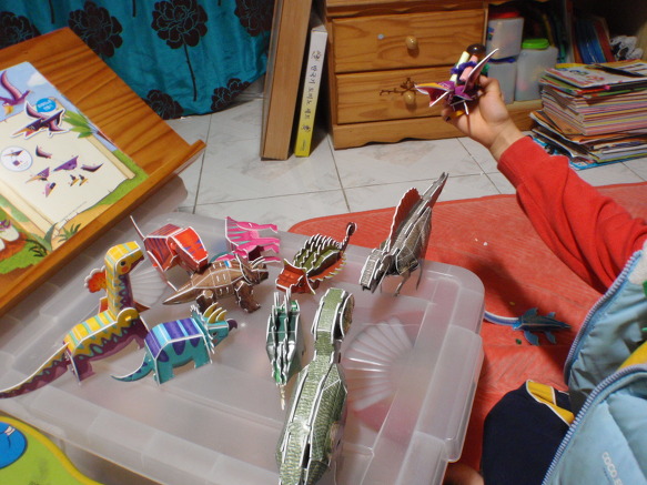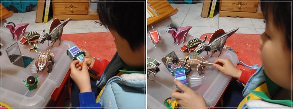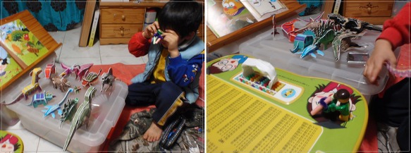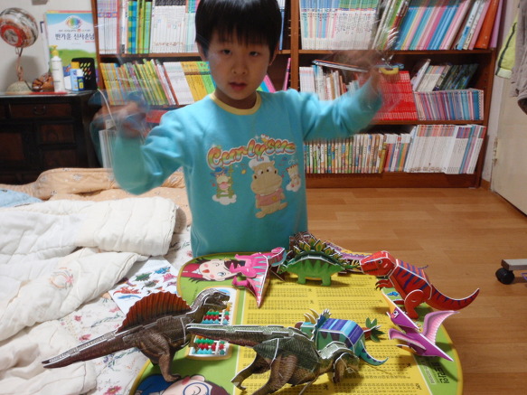 다 만든 공룡 모아놓고 엘라스모사우르스와 안킬로사우르스를 흔들어 보이며