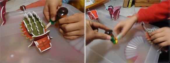 딸각딸각 소리나는 것이 만들기를 하며 나온 조각을 공룡머리부분에 넣어 공룡마라카스를 만들었네요~