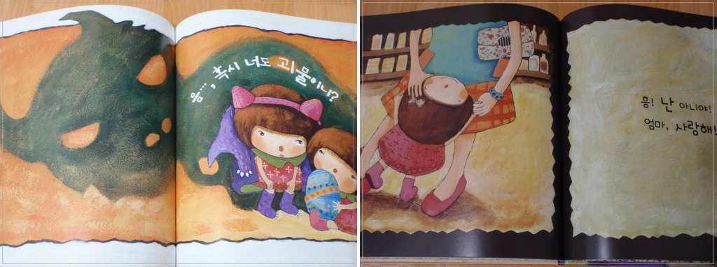 나뭇잎을 끊어먹는 티라노사우르스를 달래는 동이-나뭇잎종이를 가위로 자르며 그림과 같이 표현하네요^^