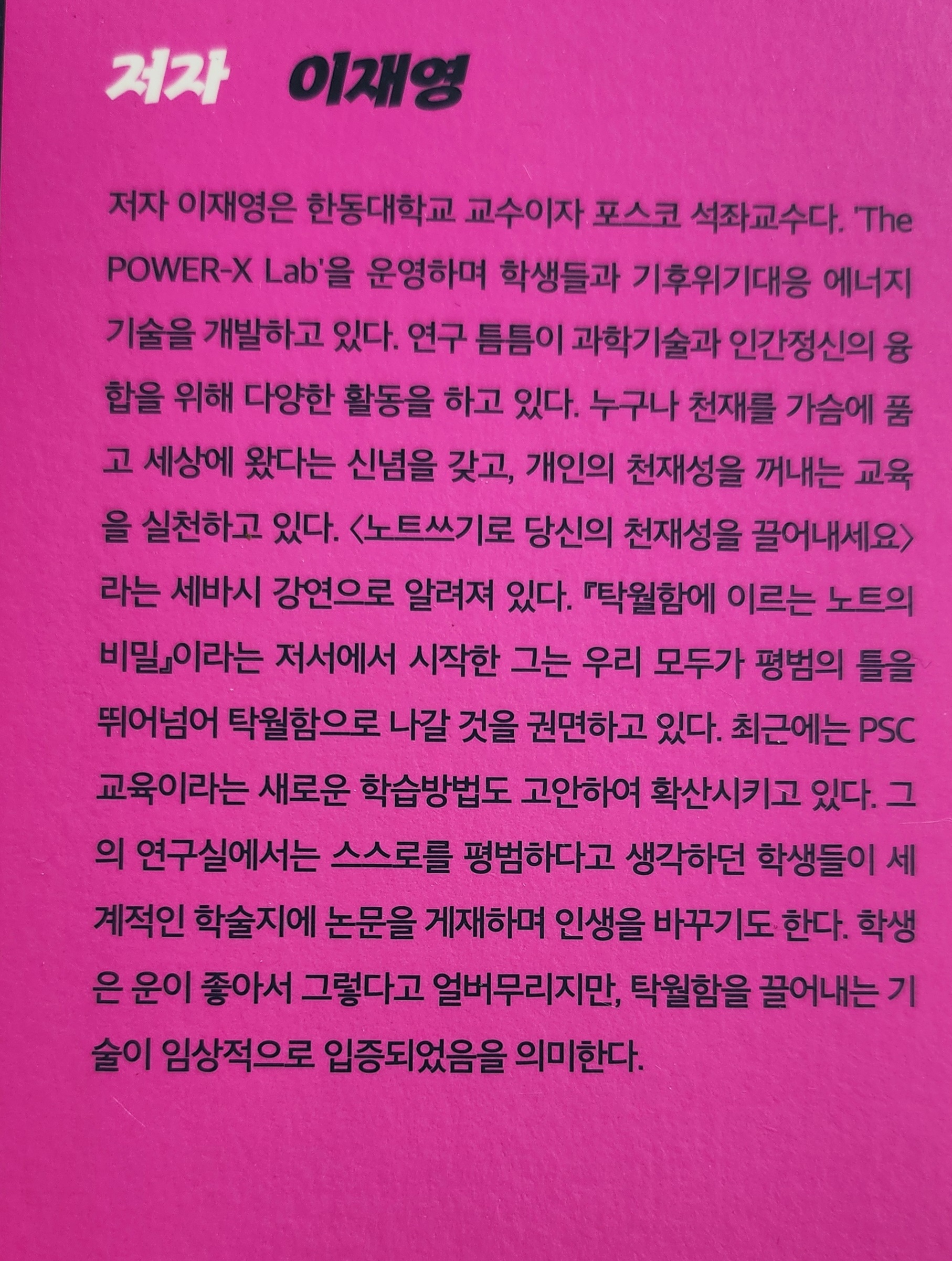 저자는 누구나 천재를 가슴에 품고 세상에 왔다는 신념을 갖고, 개인의 천재성을 꺼내는 교육을 실천하고 있다. 그 맥락에 이 책이 있다. 누구나 가지고 있는 것을 어떻게 찾아서 키울 것인지에 대한 이야기를 하고 있다.