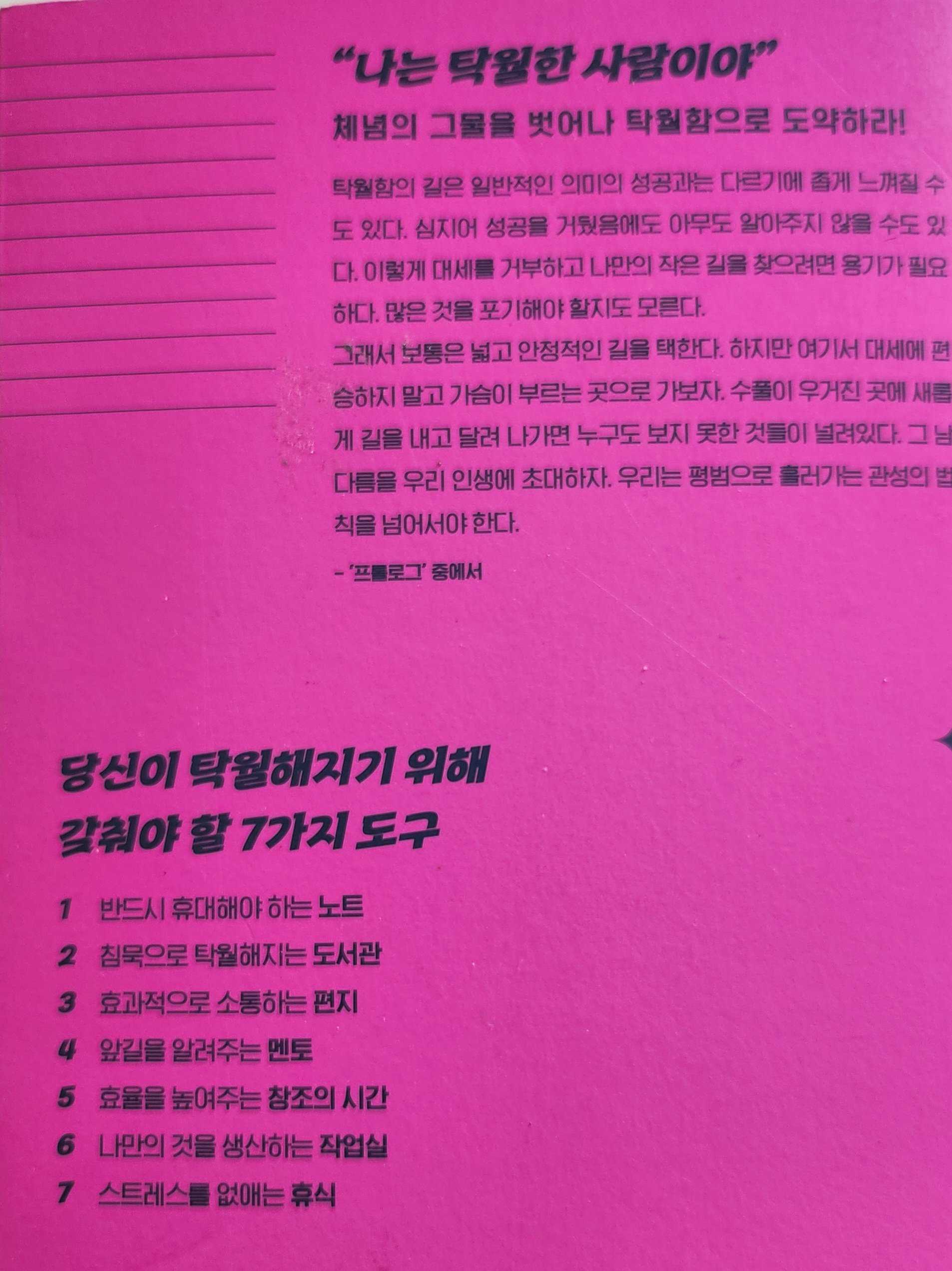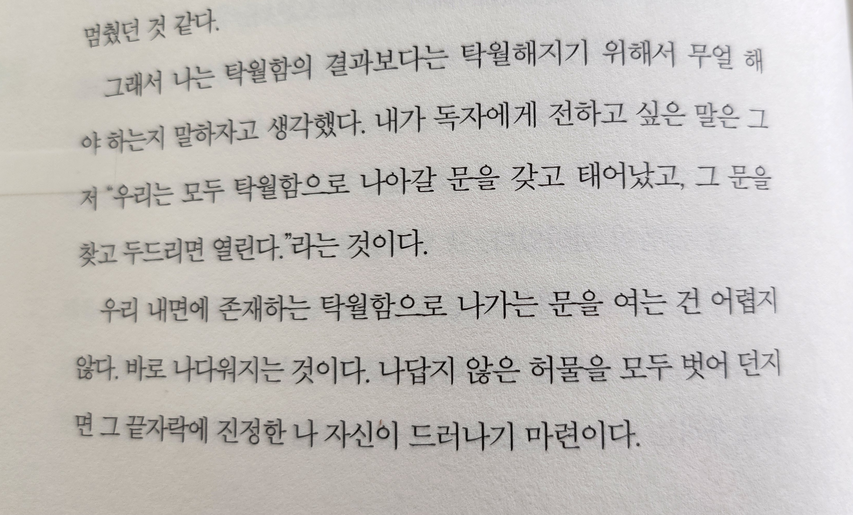 저자는 누구나 탁월함을 가지고 태어났다고 말한다. 단지 우리는 그 문을 찾고 두드리면 된다고. 그 길은 나다워지는 것이라 말한다. 나 답지 않은 허물을 벗으면 된다고. 함께 살아가야 한다는 이유는 우리는 자연스럽게 서로 맞추어간다. 그 속에서 자의든 타의든 조금씩 나다움이 아닌 것에 함께라는 이름하에 묻어둔다. 그래야 한다고 생각했다. 지나온 것이 모두 후회로 남는 것은 아니지만 아쉬움이 있다면 나다움에 대해 좀 더 생각하지 않는 것이다. 이제는 잠시 그 속을 살펴보려 한다.