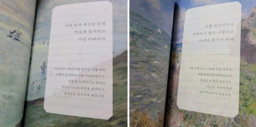 삶의 모든 상황에서 경쟁을 부추기는 오늘날의 상황에서 누군가가 이긴다면 누군가는 져야 하는 것이 당연한 진리이다. 더 잘하지 못했다고 자책하기보다 자 자신이 더 잘할 수 있는 다른 것에 집중하며 스스로를 더욱 격려하는 것이 모리 교수가 전하는 지혜이다. 우리의 삶에 마지막을 장식하는 것은 얼마나 많이 가지고 있는 소유가 아니라 관계임을 잊지 말아야 한다고 강조한다. 이 책을 읽는 동안 내가 애정하는 가수 임영웅의 노래 중에 『순간을 영원처럼』이라는 노래가 생각났다. 인생의 희로애락을 표현한 이 노래는 아프지 말고 사랑하는 사람에게 서로 더 많이 표현하고 평범하게 살아가자는 서정적 가사이다. 모리 교수의 말처럼 지금 우리는 충분히 사랑하고 아낌없이 표현하고 살고 있는지 되묻게 된다.