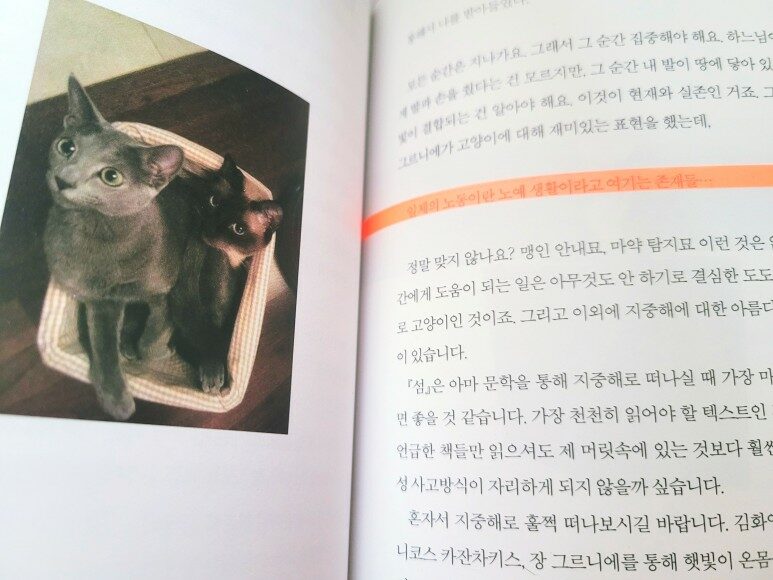 지중해를 중심으로 한 문학들의 설명에서 장 그르니에의 설명을 곁든다. 단정하고 깔끔한 그의 문장을 읽다보면 그의 철학에 대해 읽을 수 있다. 박웅현 작가 역시 고양이 집사이다보니 장 그르니에의 글에 격하게 공감하였나 보다.