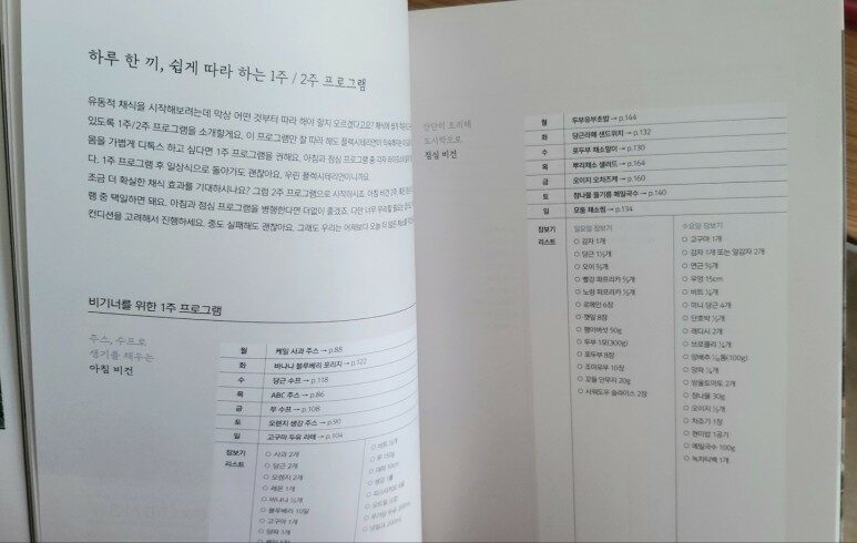 주스와 수프로 생기를 채우는 아침 비건 식단과 간단히 조리해 점심 도시락으로 먹을 수 있는 식단. 더욱 친절한 것은 장보기 리스트까지도 상세히 나와 있다. 아침 비건을 2주 할 것인지 점심 비건을 2주 할 것인지는 본인이 선택하면 된다.다만 너무 무리하는것은 금지!실패해도 괜찮으니 천천히 몸이 적응하도록 한번 시작해 보는데 의의를 두자는 것이다.