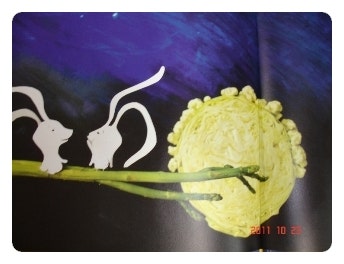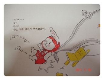 엄마를본 아기토끼들은 너무행복해하고..노란떡을먹고 몸이 풍선처럼 부풀어서..달나라까지가고..다시가면 빨간떡을먹겠죠??^^