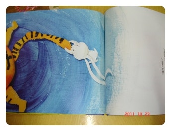 호랑이는욕심나서 떡을 두개나먹어 몸이점점커져서 풍선처럼 부풀고~그때 호랑이 뱃속에서 엄마목소리가들려 지퍼를그려서 열자 엄마가