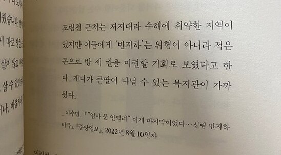 “기왕 이사하게 되었으면 방세가 좀 더 싼 서울 외곽 동네를 알아보지, 왜 행당동을 떠나지 않느냐는 게 제 물음이었습니다. 그런데 노인의 대답은 너무 간명해 오히려 저를 당황하게 했습니다. 노인은 폐지를 주워서 남편의 생계까지 책임지고 있는데, 오랫동안 폐지를 거래했던 고물상이 그 동네에 있다는 것, 그것이 노인이 행당동 근방을 떠나지 못하는 이유였습니다.”