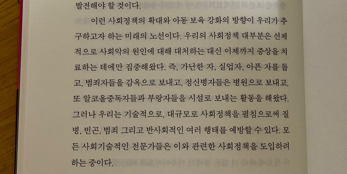 “사회는 불균형하고 불안정한 소득분배에서 야기되는 개인들의 사회 부적응에 대해 큰 책임을 져야 한다. 이에 대한 피해는 아무 죄가 없는 아이들에게 고스란히 간다.”