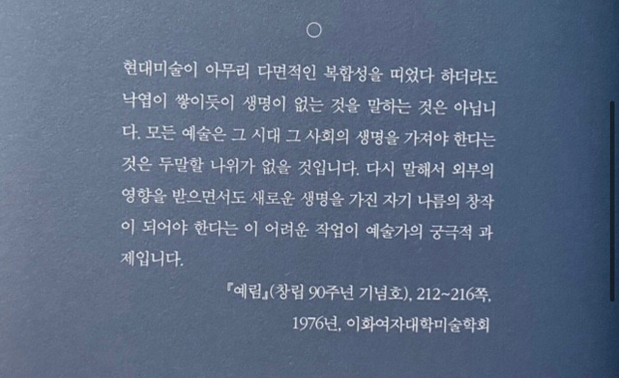 김종영 선생은 아름다움을 염두에 두고 작품 활동을 하지 않았다. 정직하고 순수한, 있는 그대로의 시각적 요소를 받아들이면서 미를 쫓지 않는 활동으로 그 이상의 작품을 완성 해왔다. 예술가는 말이 없고 예술작품 스스로가 제 몸짓으로 무궁무진한 말을 한다는 김종영 선생의 말을 생각하면 작품이 인정받기까지 작품을 느끼고 해석하는 관중의 역할이 중요하게 여겨진다. 그래서 예술작품의 말을 잘 알아들을 줄 아는 사람이 되는 길을 김종영 선생이 남긴 이 책을 통해 조금은 알 수 있었다. 또한 진정한 관중은 자기 자신이기에 결국 작품은 자신을 위해서 제작한다는 말도 남겼다.