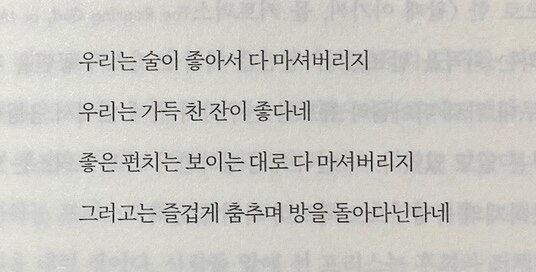 술만 있으면 없던 용기도 생긴다. 술이 들어가면 들어갈수록 대담해지고 속을 드러내는 일이 쉬워지며 노래 부를 때 고음도 잘 올라간다. 나에 대한 자신감까지 밀려오면 여러 번의 건배에도 지칠 줄 모른다. 신나는 일이다. 이런 기분을 처음 느껴보는 순간이라면 차력사가 칼을 삼킬 때 찢어질 듯한 고통을 맛본 자의  칼칼한 용기가 쑤-욱 올라오는 쓴 미소가 떠오르면서 실비아 플라스의 말이 떠오를 것이다.