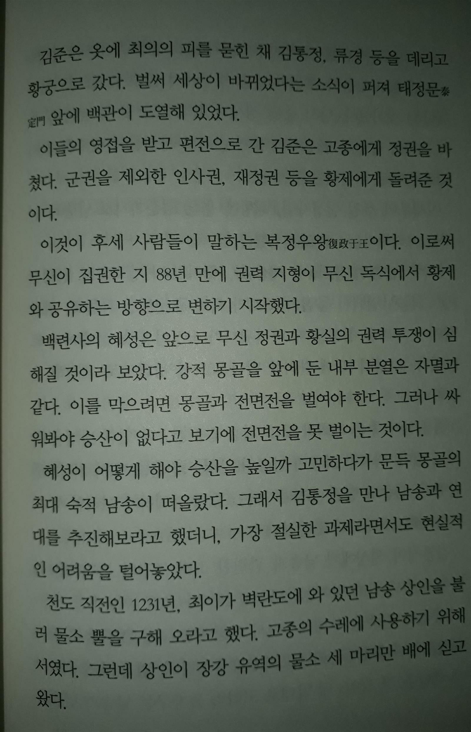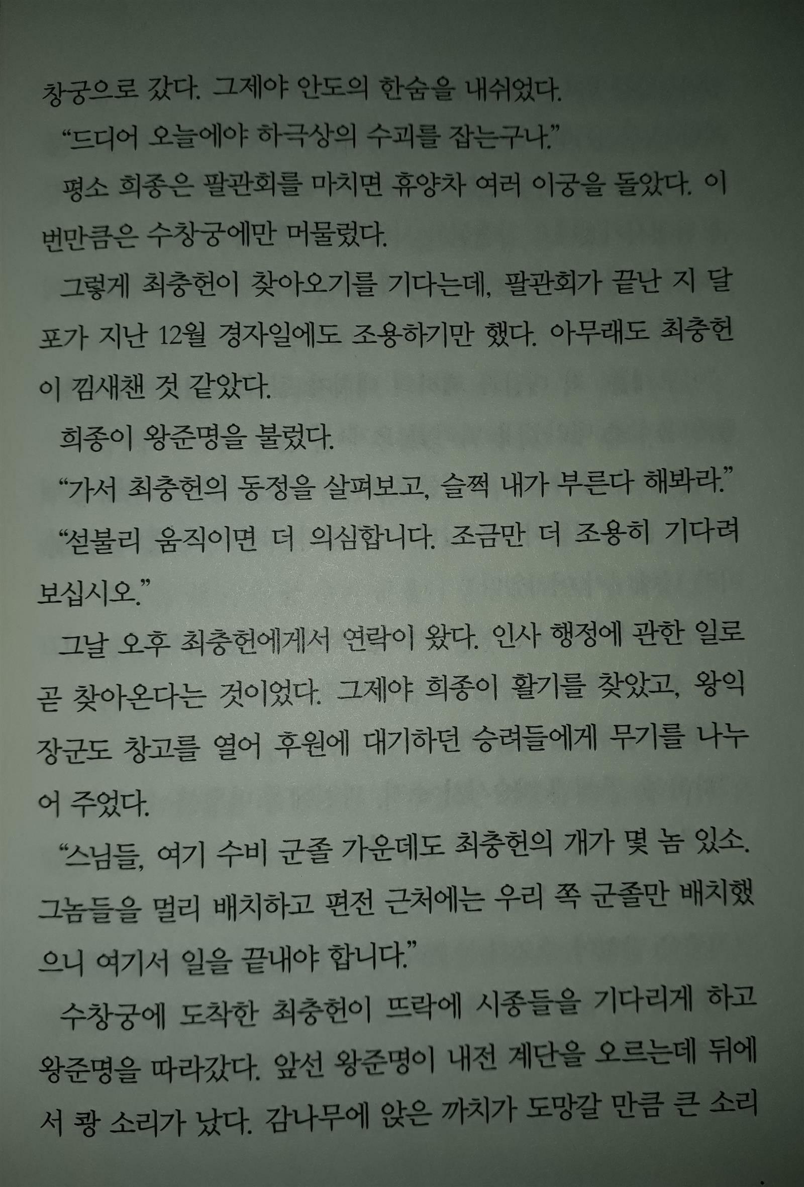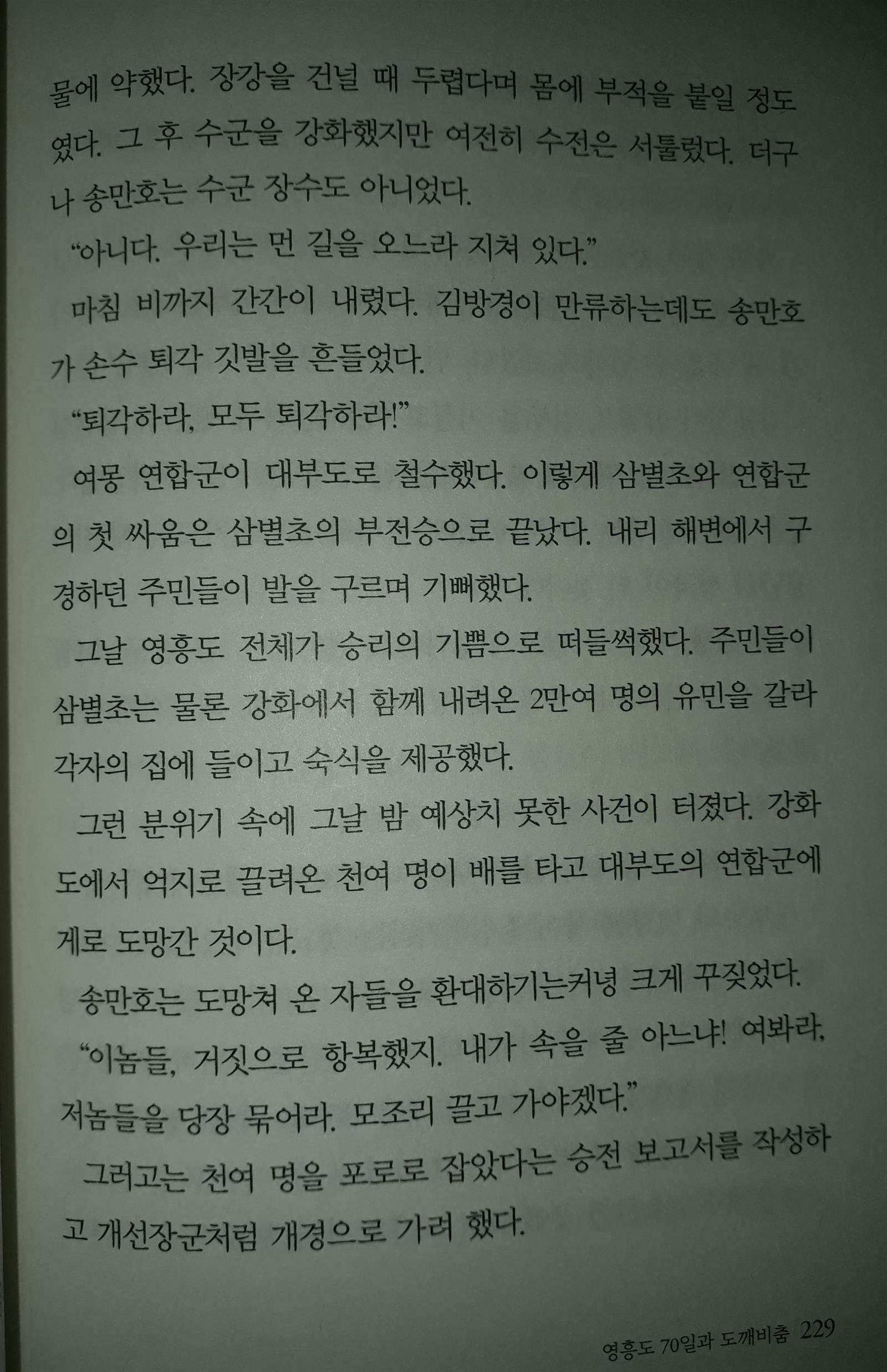 절대 자유를 향해 절대 고독으로 나아간 삼별초. 그들은 신분의 굴레를 거부했고,삶과 죽음의 방식까지 스스로 택할 주체적 자유를 갈구했다. 정치 일선에서 물러 선 있던 김통정마저도 김영을 찾아가 흉흉한 민심을 전했다. 그래도 김준은 내 자식 문제라고 말을 못 꺼내게 막았다. 그때부터 김통정은 정사에 완전한 거리를 두고 교동도에 은거했다. 가끔 배중선과 만나 수군 훈련과 작전에만 교류했다. 정신이 번쩍 든 달래가 호의 무사들이 머물던 옆 방에 가보니 비어 있었다. 떨리는 가슴을 억누르며 약속한 열흘동안 기다릴 수 밖에 없었다. 김통정 일행이 진도를 향해 전속력으로 항해할 때 벽파진 건너편 삼견원에는 토벌군 6천여 명과 1만 8천 필이 속속 도착했다. 토벌군을 병선 200척을 비롯한 400여 척의 배가 물 위에 둥실거리며 기다리고 있었다. 달래는 손을 들어 한라산을 가리켰다. 그때 마침 붉은 오름 쪽에서 흰 연기가 피어올랐다. 달래의 가슴이 덜컥했다. 특히 서남해상에서 극한의 절박함 속에 전개된 대미의 3년은 차라리 밤하늘의 별처럼 서정적이었다. http://cafe.naver.com/jhcomm/13279 리뷰어스 클럽 서평 하단 배너 대한민국 모임의 시작, 네이버 카페 cafe.naver.com #장편소설 #삼별초 #이동연 #창해 #리뷰어스클럽 ♤출판사로부터 도서를 제공받아 작성된 리뷰입니다.감사합니다.