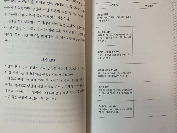 현재 두 아이를 키우면서 하락했던 자존감과 우울감으로부터 어느정도 회복되었고, 시간을 헛되이 보내지 않기 위해 다양한 취미활동으로 하고 있지만 생각처럼 행복하지 않았다. 왜그럴까? 생각하던 내가 이 책을 통해 깨닫게 되었다. 바로 시간을 잘 활용하지 못했기 때문이었다. 평소 조금 더 저렴한 물건을 사기 위해 많은 시간을 소비하고, 최소비용으로 모든 것을 해결하면서 시간을 소비하다보니 해야할 일들은 남는 시간에 해야했기에 해냈을 때는 뿌듯하지만 늘 벅찼고, 몸과 마음이 지치고 힘들었다.