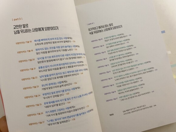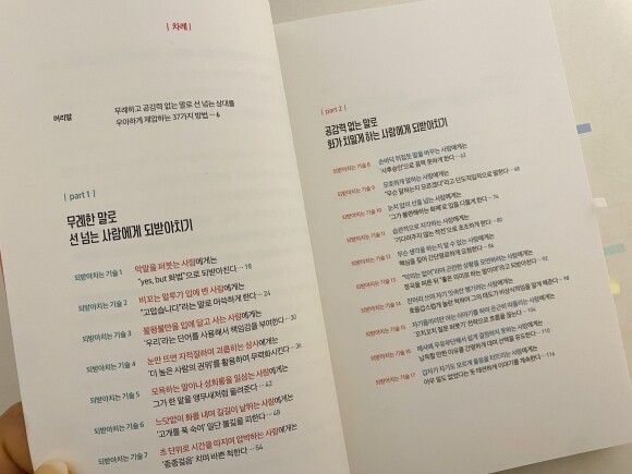 총 4개 part로 나뉘어져 무례하고, 공감력 없고, 교만하고, 이기적이고 배려심 없는 그대들에게 되받아치는 기술들을 만나볼 수 있다.