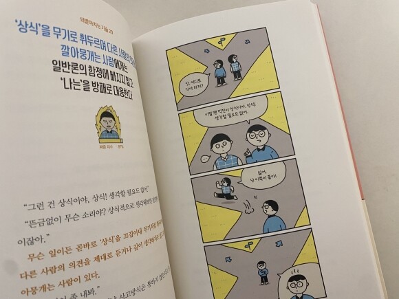 이 책의 주제는 ‘되받아치기’ 라고 한다. 갑자기 훅 들어온 말에 제대로 받아치지 못하고, 잠자기 전 이불속에서 이불킥하며 “이렇게 말했어야 했는데…” 라면서 후회하는 우리들에게 가볍게 되받아치는 기술이 무려 37가지가 담겨져 있다.