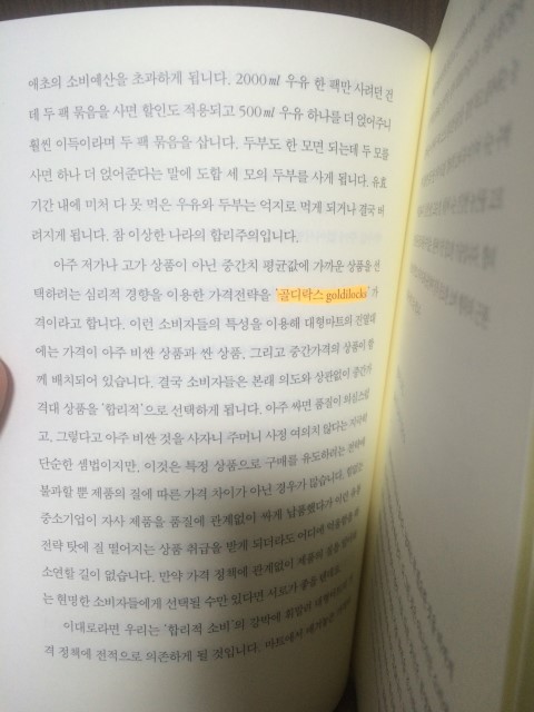 저자는 주변에서 흔히 일어나는 다양한 소비패턴을 나열해줍니다. 그 중에서 '골디락스' 전략은 저로하여금 뜨끔하게 했습니다. 마트에서 남편과 장을 볼때면 너무 싸면 품질이 떨어지는걸까봐  비싼거는 우리가 굳이 비싸게 주고 살 필요가 있나? 이런 생각에 결국 중간쯤을 택하게 됩니다. 그런데 이것이 기업의 상술중 일부란 사실에 놀랐습니다. 바로 이런 부분들을 알려주면서 독자들에게 정말 본인에게 합당한 소비를 하고 있는지 되돌아보게끔 합니다.