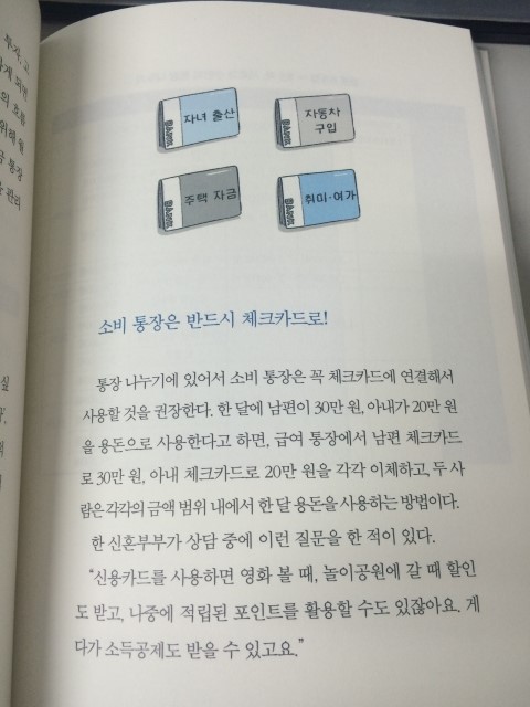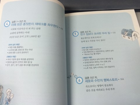 다른 재테크 책들에 비해서 아직 자녀가 없는 신혼부부라면 꼭 이 책을 한번 읽어봄직 합니다. 살다보면 자신이 계획한대로 살 수가 없습니다. 신혼부부일 경우 서로 다른 삶을 살아오던 두 사람이 만나 살림을 합치는 것이기 때문에 보다 시행착오가 많이 발생할 수 있습니다. 결혼도 늦어지는 판국에 혹여나 출산이 당겨진다면 더더욱 돈 모으기는 힘듭니다. 그만큼 재테크에 대한 대비는 빠르면 빠를 수록 좋습니다. 신혼부부 5년 이내에 단계별로 진행되면 좋을 부분들을 체크해 두었기에 차근차근 따라보해보면 됩니다. 이미 통장 쪼개기, 살림합치기는 이루어져있기에 저자가 말하는 부분과 하나하나 맞춰가는 재미도 느낄 수가 있습니다.
