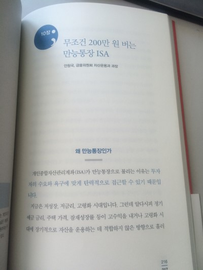 2016년 초반인 현재로서 이 책이 정말 제격이라고 느껴진 부분 중 하나가 바로 ISA때문입니다. 재테크 관련 카페나 은행에서 ISA계좌가 2016년에 핫이슈라는 것은 알고 있었습니다. 하지만 제대로 들여다 본 적은 없었습니다. 그저 막연하게 나중에 여유가 되면 알아봐야지라고 생각만했습니다. 그런데 마침 이 책에 자세히 설명이 되어 있어서 앞으로 재테크 계획을 짜는데 도움이 많이 됐습니다.