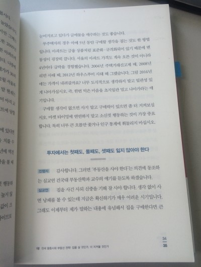 경제흐름을 파악하기 위해 읽기 시작한 저에게 담화식으로 전개된 내용은 매우 당혹스러웠습니다. 어떤 면에서는 토론현장을 보는 듯한 느낌이 들어 색다르게 느껴지긴 했습니다. 그런데 그냥 서술식에 익숙했던 저에겐 가독성에 있어서 조금은 애로사항이 있었습니다. 혹여나 뒷부분까지 이런 방식으로 전개되면 다 읽을 자신이 없을 정도였습니다. 하지만 다행히도 나머지 부분은 그야말로 각 전문가들이 전망하는 재테크 정보들이 주를 이루고 있습니다.