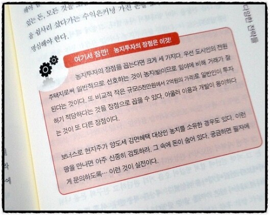 이 책에는 저자의 실전 경험이 담긴 토지 투자 노하우만 담겨 있는 것이 아니다. 저자의 실패와 성공 과정도 함께 담겨 있다. 그동안 저자가 걸어왔던 수많은 시행착오 과정에서부터 지금의 자리에 이르기까지 진정한 성공과 노력의 가치를 이야기한다. 그런 면에서 이 책은 토지 투자와 관련된 경제경영서면서 진정한 성공의 길을 이야기하는 자기계발서라고도 할 수 있다. 이 때문에 앞부분의 2번째 장까지는 저자만의 인생 이야기가 담겨있는 것이 특징이다.