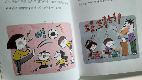 우리 반 선생님도 친절하면 얼마나 좋을까? 조심하라고 잔소리만 하잖아. 놀아주지도 않고... ... 맞아. 2반 선생님처럼 우리랑 친했으면.....소원이야! - P17