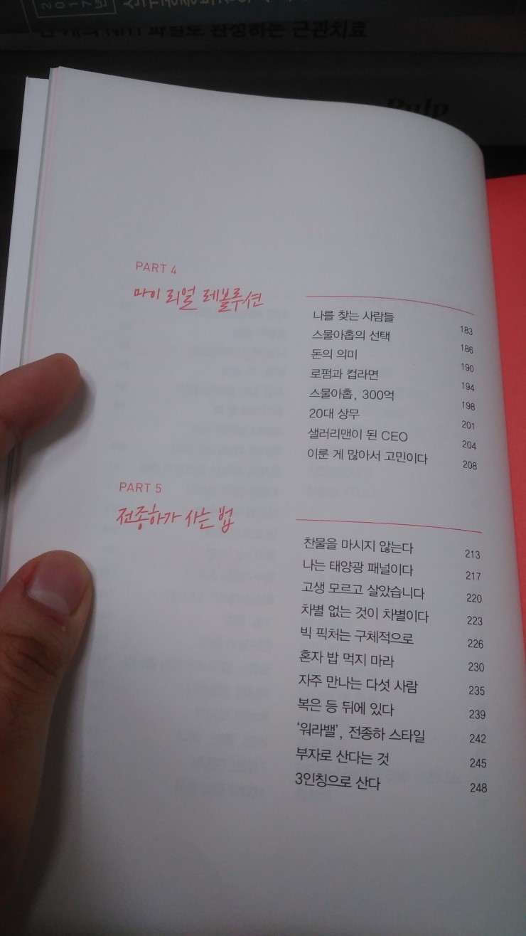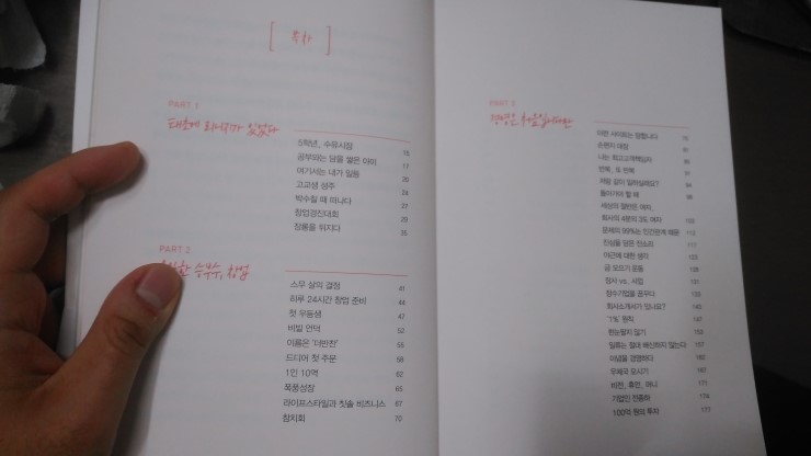 이 책의 목차는 위의 사진처럼 되어있는데 파트 1에서는 저자의 10대 학창시절, 파트 2에서는 창업을 시작하고나서 초창기에 있었던 일들 파트 3에서는 사업체를 이끌어나가면서 체득한 팁들이 서술되어 있다.
