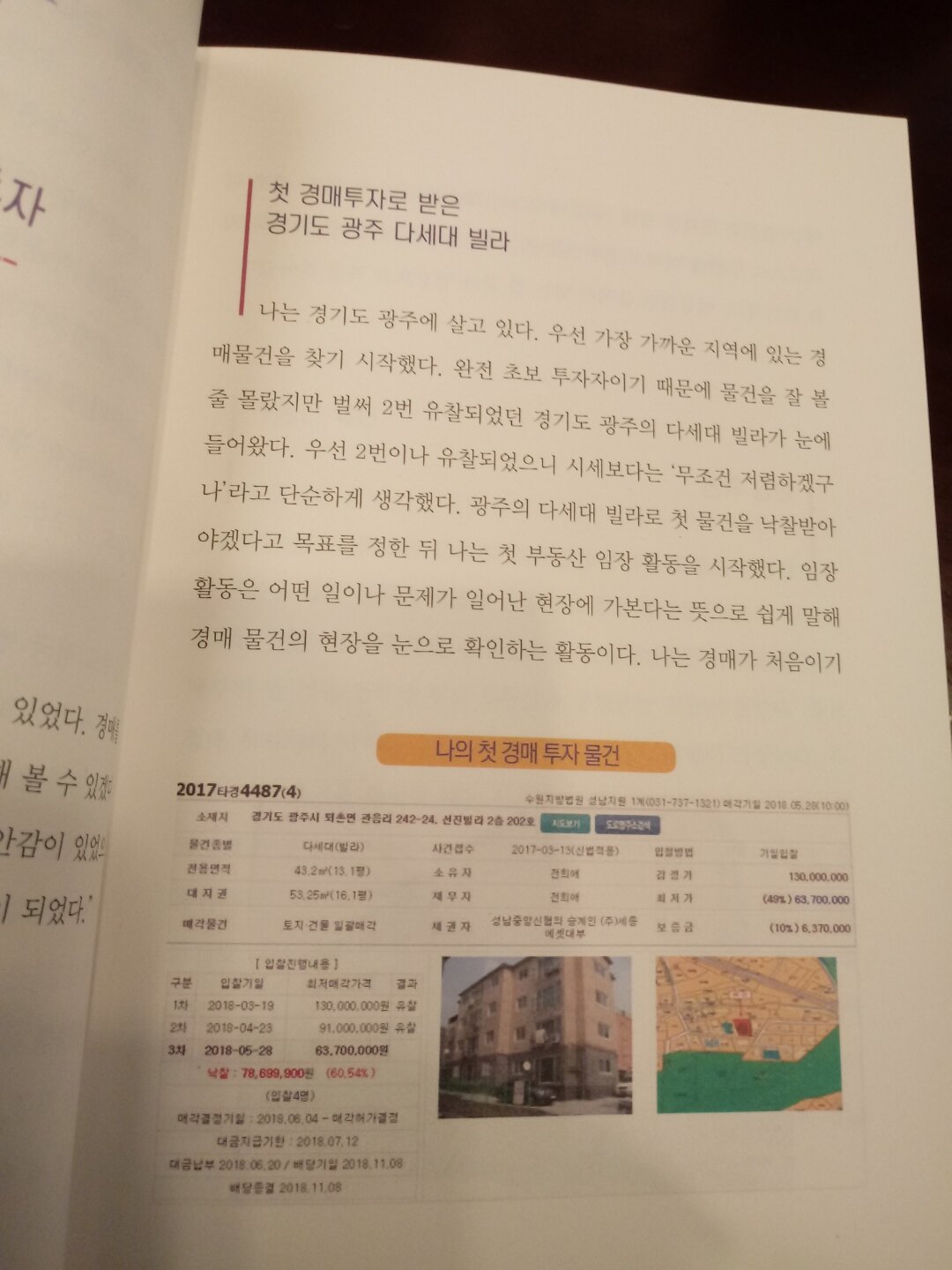 난생 처음 경매를 할때 수중에 얼마의 돈이 있었으며 어떻게 경매 물건을 찾기 시작했는지(저자의 경우는 살고 있는 지역에서 가장 가까운 지역의 경매 물건을 찾음), 임장 활동을 통해 어떤 점을 봤는지(현장 사진이 실제로 나와있어서 더 좋았다.))