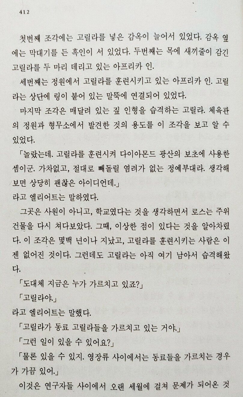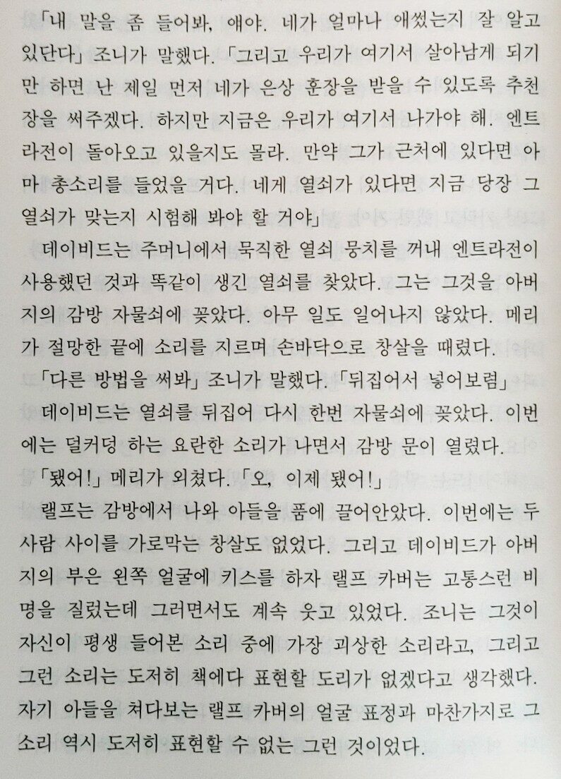 딱 장르소설이다. 지금까지 읽은 킹의 소설들 중 상당히 공포스러운 분위기를 보여준다.