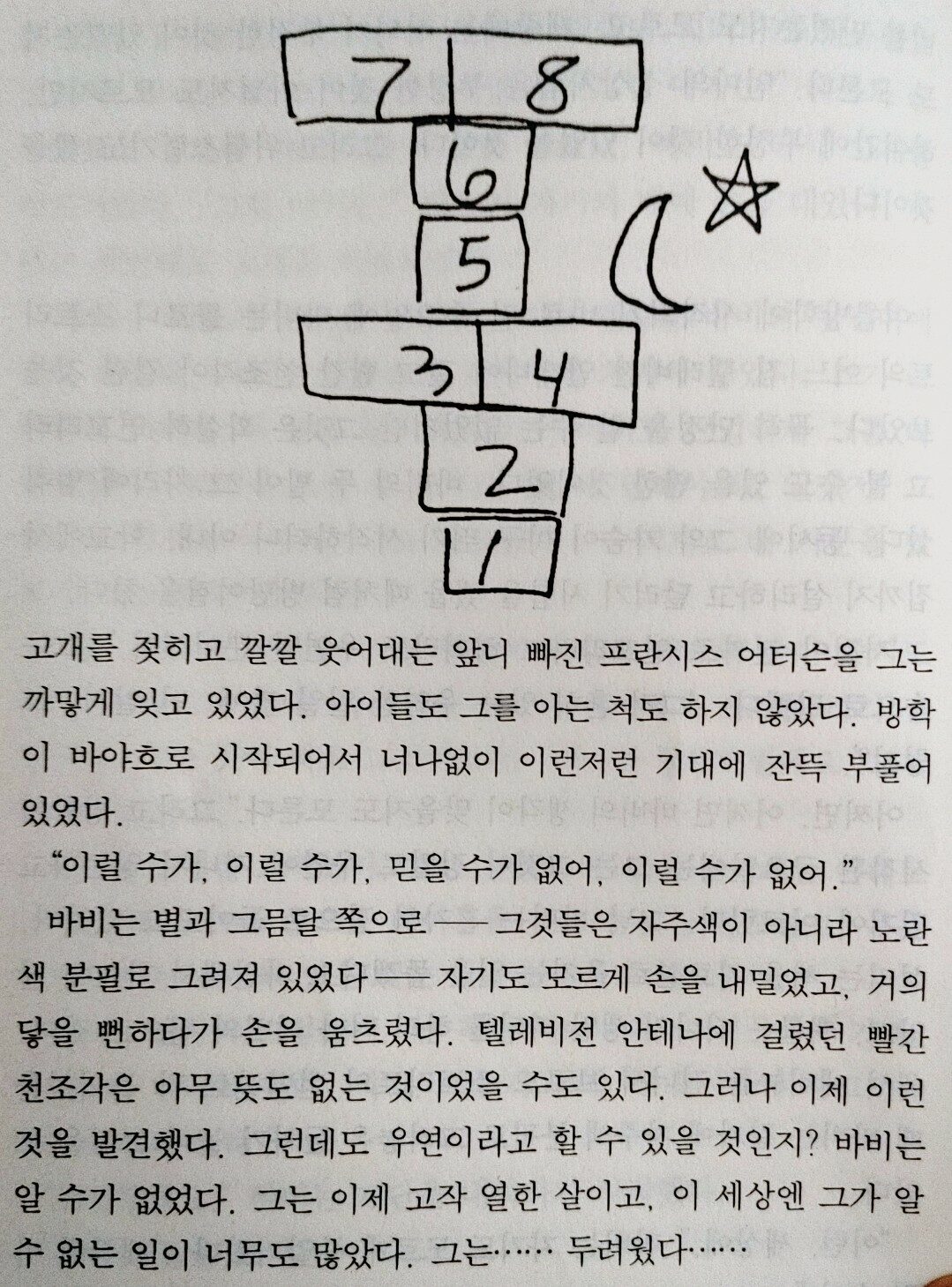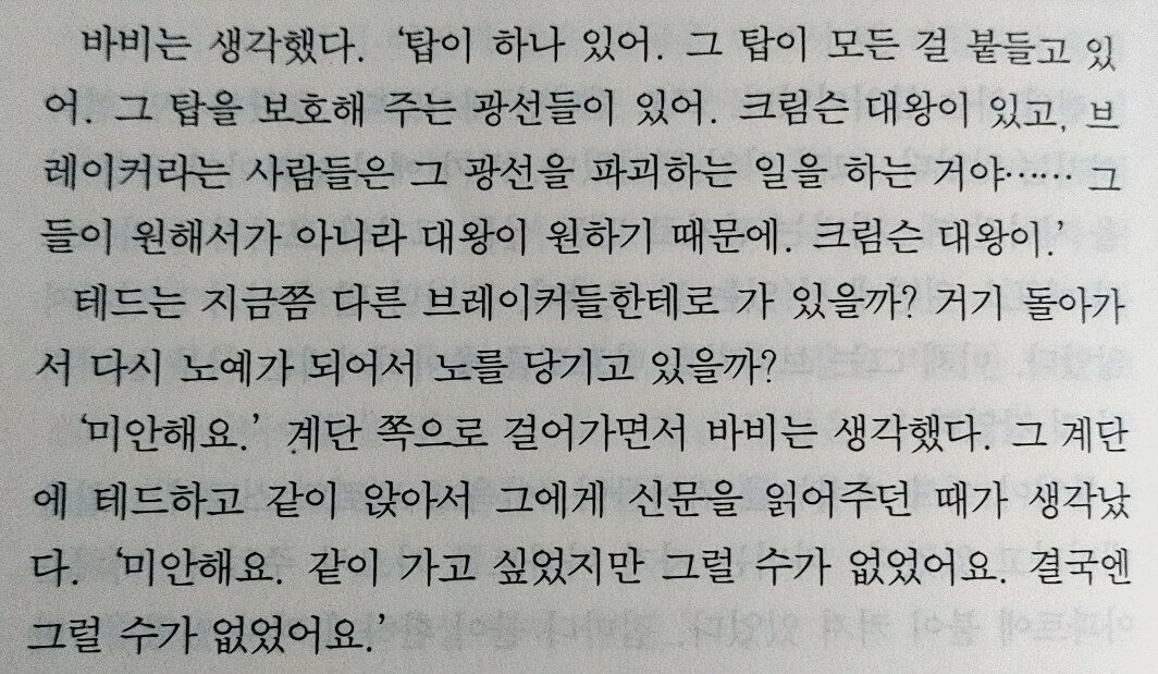 다크타워 시리즈를 조금이라도 읽었더라면, 초반에 테드가 무엇을 두려워하는지 알 수 있었을 테지만, 나는 테드가 두려워하는 것이 무엇인지 전혀 몰랐기 때문에, 좀 더 바비처럼 두려워하면서 공포와 호기심을 끝까지 가지고 갈 수 있었던 듯싶다.