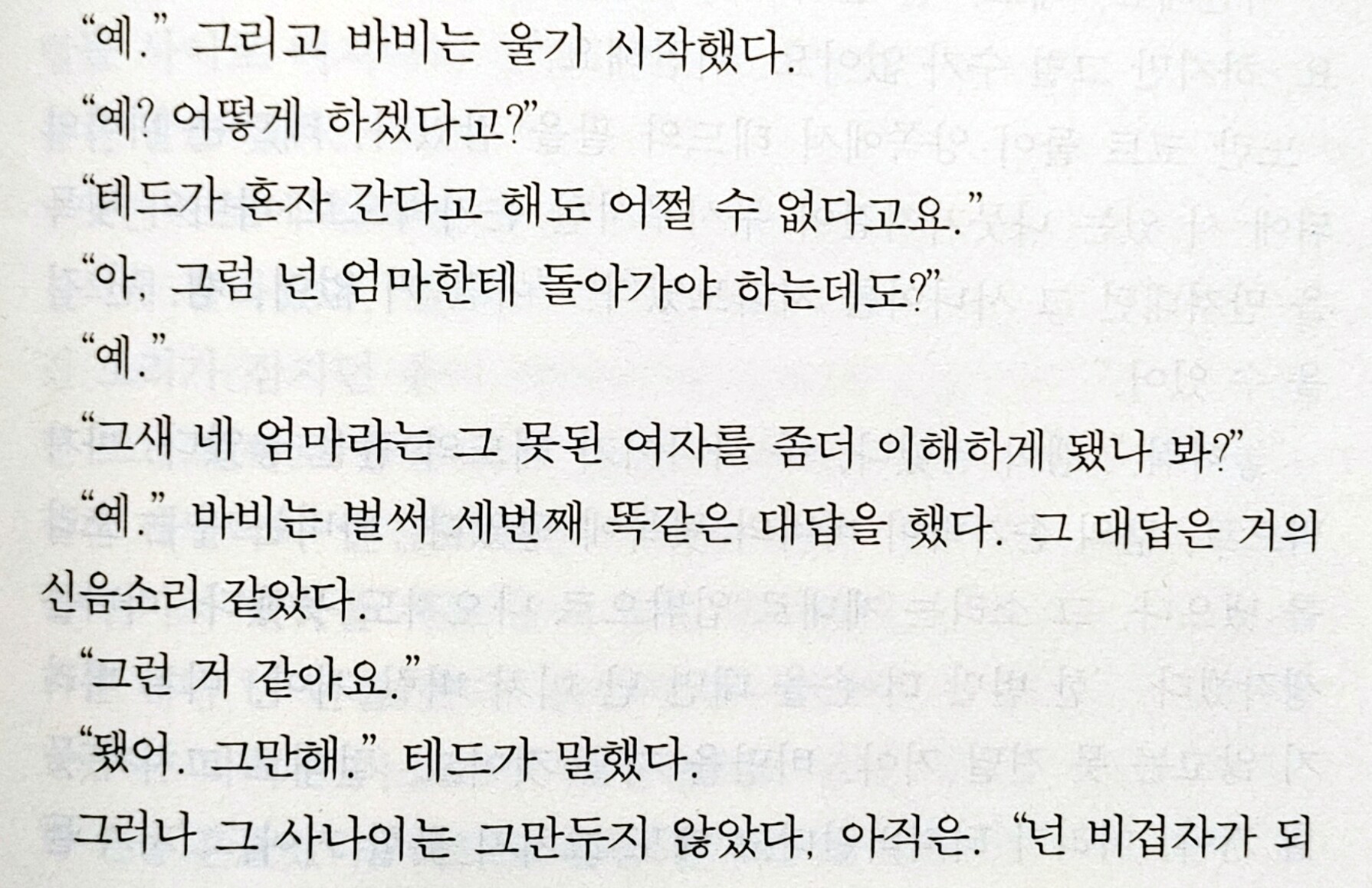 처음에는 바비가 테드와 함께 가겠노라고 하지만, 결국 그들의 존재를 느끼고 두려움에 굴복하여 집으로 돌아가겠다고 하면서, 테드에게 미안해하는 장면은 이 착한 아이에게 너무 가혹하고 비참하다. (눈물샘에 자극이...)
